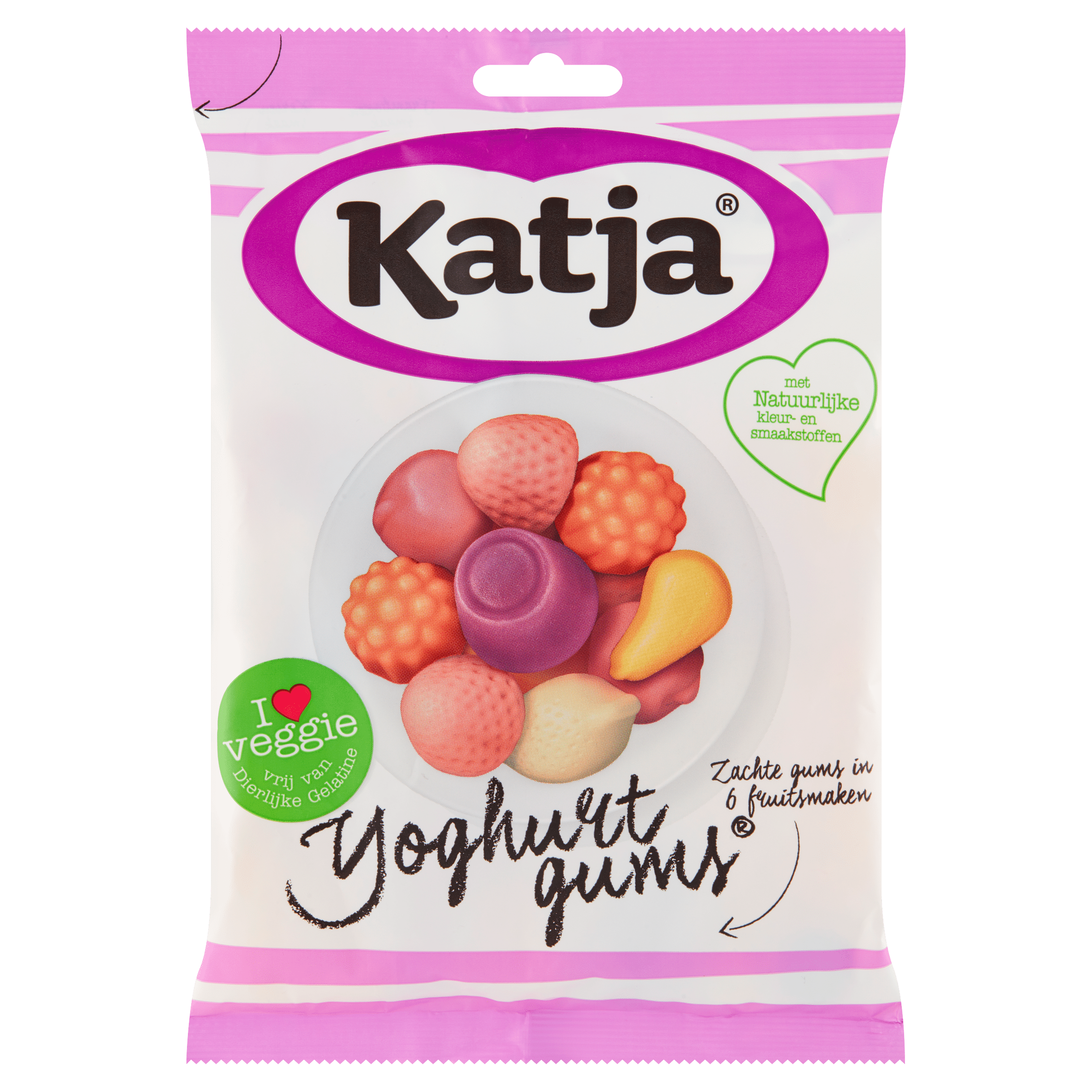 Met natuurlijke kleur- en smaakstoffen Vrij van dierlijke gelatine Dit toetje gaat er altijd in: de originele Katja Yoghurtgums. Al sinds 1971 een absolute topper in snoepland. Hoe dat komt? Omdat ze zo lekker zacht en fris zijn, in maar liefst zes verschillende heerlijke fruitsmaken. Gemaakt met echt fruitsap, gewoonweg onweerstaanbaar!