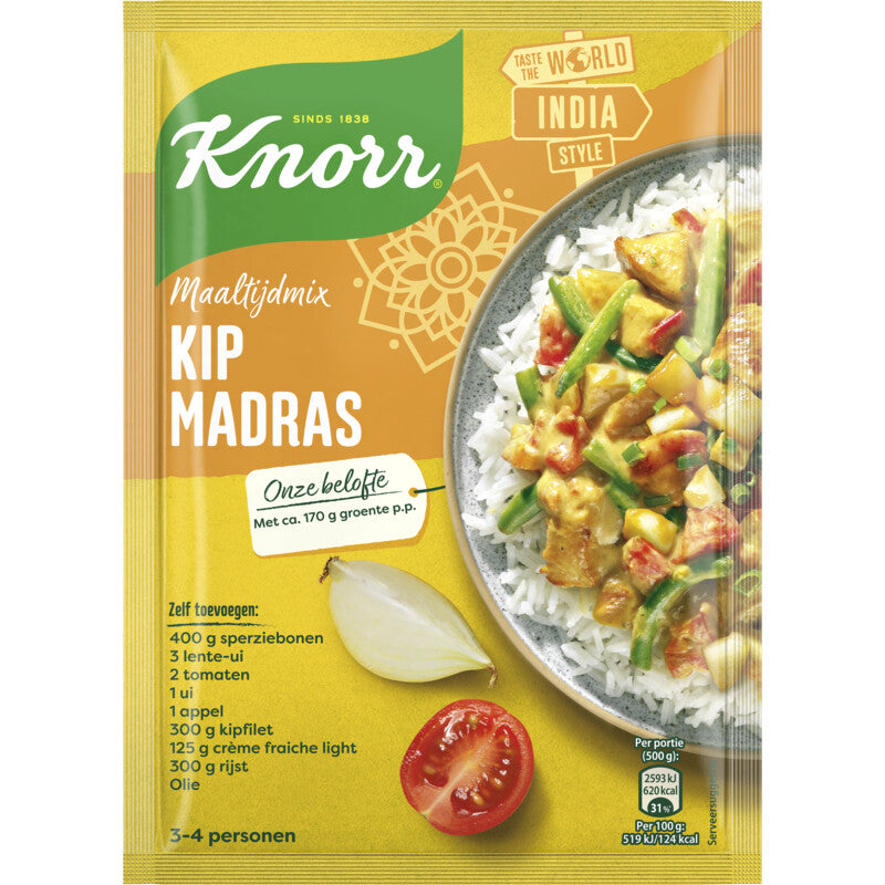Knorr Kip Madras Maaltijdmix is makkelijk en snel te bereidenDeze avondmaaltijd bevat ca. 170 g groente per persoonDeze Kip Madras is een gerecht voor 3 tot 4 personenMet zorgvuldig gedroogde en gemengde kruiden en specerijenMix zonder conserveermiddelen