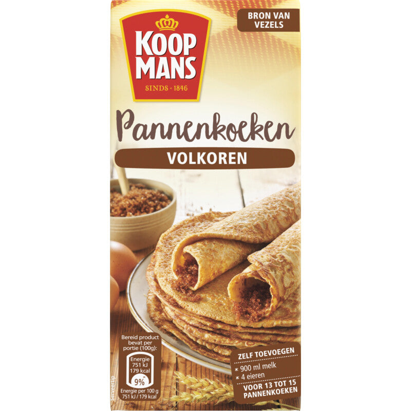 Koopmans pannenkoeken volkoren is een klassieke pannenkoekenmix gemaakt van volkoren havermeel, volkoren tarwemeel en boekweitmeel. Een pak is voldoende voor 13-15 pannenkoeken Hartig of zoet? Bak wat jij wilt Zelf toevoegen: 900 ml melk en 4 eieren Al sinds 1846 maakt Koopmans het Nederlandse gezinnen makkelijk om zelf iets lekkers te bakken.