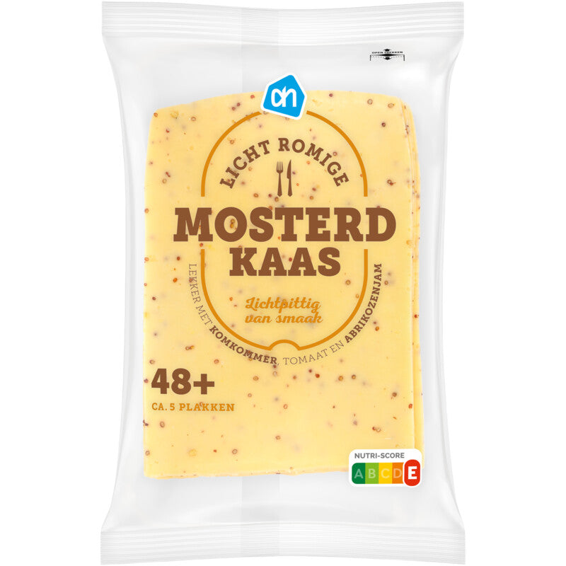 Ontdek de heerlijke Licht Romige Mosterdkaas 45+ plakken van Albert Heijn. Deze unieke kaas combineert een zijdezachte romige textuur met de pittige kick van mosterdzaadjes. Perfect voor op je boterham, maar ook een briljante toevoeging aan een kaasplankje!