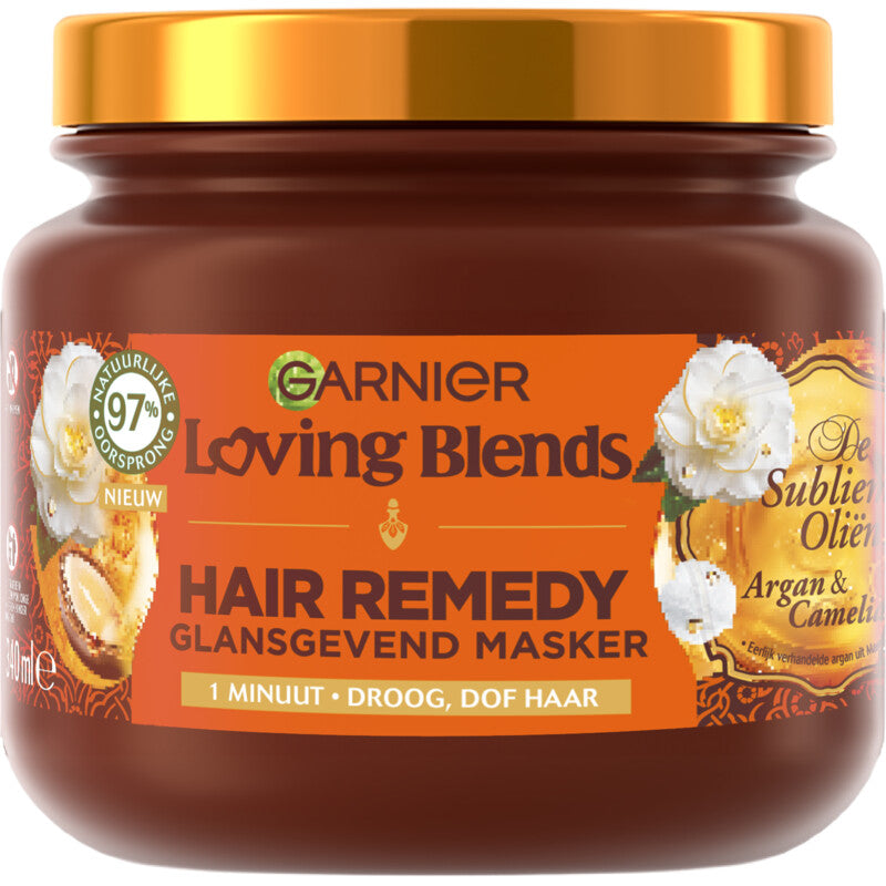Loving blends argan en cameliaolie masker is een voedend, glansgevend masker voor droog en dof haar, dat het haar in slechts 1 minuut tot 7x meer voedt. Je haar wordt in slechts 1 minuut tot 7x meer gevoed 97% natuurlijke oorsprong Zonder siliconen, voor een natuurlijk gevoel Eerlijk verhandelde biologische arganolie uit Marokko