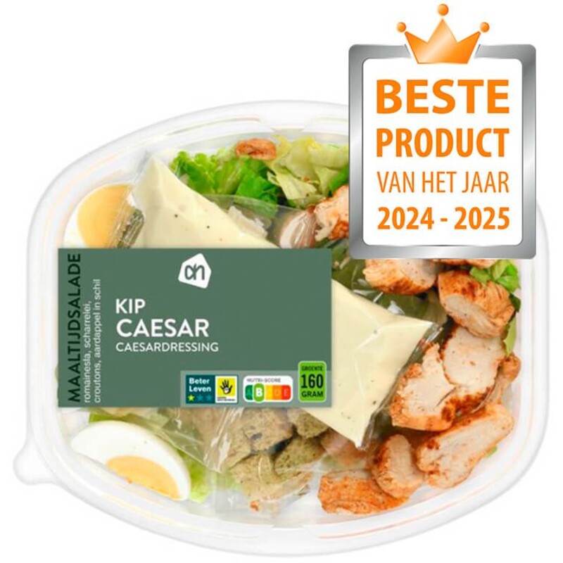Ingrediënten: groente (22% ijsbergsla, 14% romainesla), aardappel, 14% kipfiletᵃ, water, scharreleiᵃ, melk, plantaardige olie (raap, palm), tarwebloem, suiker, specerijen (o.a. mosterd, 0,1% knoflook), scharreleigeel, wittewijnazijn, gemodificeerd maïszetmeel, zout, voedingszuur (kaliumlactaat [E326], natriumacetaten [E262], citroenzuur [E330], natriumcitraten [E331]), kaaspoeder, dextrose, zeezout, limoensapconcentraat, voedingsvezel (citrus, bamboe, aardappel), kruiden, conserveermiddel (gebufferde azijn [E267], azijnzuur [E260]), 0,1% ansjovispasta, gist, azijn, emulgator (bèta-cyclodextrine [E459]), rozemarijnextract, verdikkingsmiddel (xanthaangom [E415], guarpitmeel [E412]), gistextract, knoflookextract, vitaminen (B3, B1), mineralen (ijzer, calcium), stremsel. ᵃBeter Leven keurmerk 1 ster.