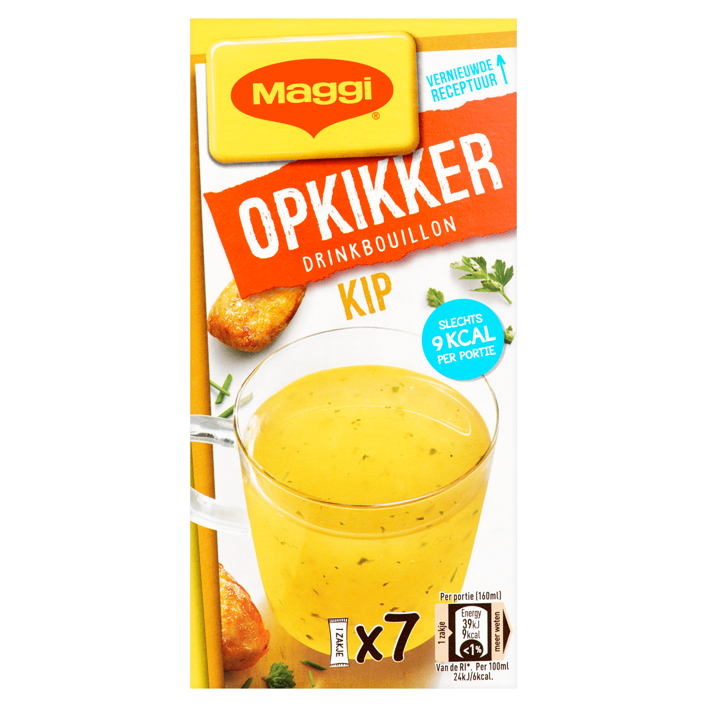 MAGGI Opkikker drinkbouillon kip is een lekker hartig tussendoortje! Het bevat maar 9 kcal per portie bouillon en is vol van smaak. Daar kikker je van op!