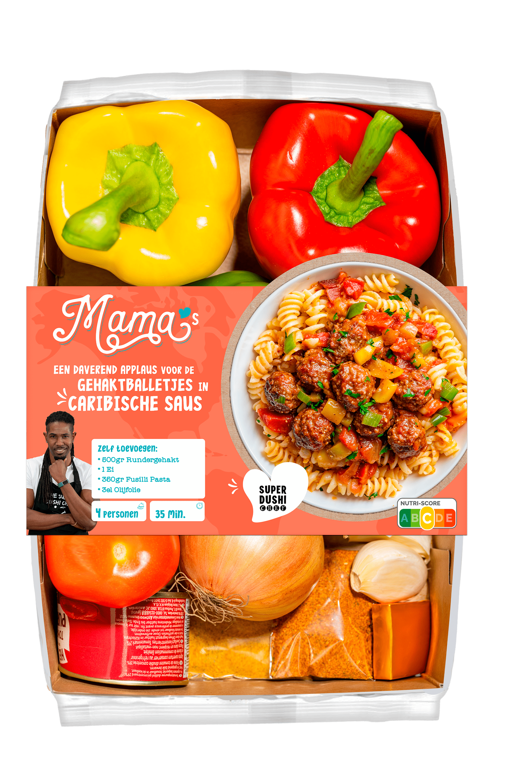 Zelf toevoegen: *600gr Rundergehakt, *1 Ei, *360gr Fusilli Pasta, *3el Olijfolie. 4 personen, 35 min. ZOALS SUPER DUSHI CHEF 'T BEREIDT: 1. Spoel de groente af onder de kraan, dan kunnen we met koken verder gaan. 2. Pel de knoflook en uien en snijd ze heel fijn, dit wordt 'n gerecht om trots op te zijn. 3. Snij dan blokjes van de paprika's en tomaat voordat je met het gehakt verder gaat. 4. Meng het gehakt met de specerijenmix voor gehakt en 'n ei en doe er ook de helft van de gesneden uien bij. 5. Kneed het gehakt en maak er balletjes van, zo groot als een pingpongbal als een echte vakman. 6. Kook de pasta zoals het hoort, op de verpakking staat dat woord voor woord. 7. Verhit de olie in een pan en bak de gehaktballetjes goudbruin gaar, draai ze regelmatig om, we zijn nog niet klaar. 8. Zijn ze mooi bruin? Haal ze uit de pan, dan gaan we verder met het krioyo-plan. 9. Fruit in dezelfde pan de andere helft van de gesneden uien, paprika's en knoflook. Specerijenmix voor saus erbij, dan smaakt 't echt Caribisch ook! 10. Voeg dan de tomatenpuree toe en bak één minuut mee, dan is je saus al bijna oké. 11. Meng het bouillonblokje met 350ml kokend water, dan wordt het heerlijk smullen later. 12. Giet de bouillon in de pan en laat het 10 minuten zachtjes koken... dat het lekker wordt had je zeker al geroken? 13. Doe dan de balletjes weer terug in de pan, laat ze nog 10 minuten pruttelen, zo hoort dat dan. 14. Serveer de gehaktballetjes met de pasta, niet met sushi, vanavond eten jullie Super Dushi!
