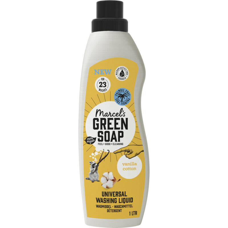 Marcel's green soap universeel wasmiddel vanilla en cotton voor de witte en gekleurde was. Palmolievrij Microplasticvrije formule Tenminste 95% biologisch afbreekbaar, 100% vegan, 100% gerecycled plastic Goed voor 23 wasbeurten Met het wasmiddel van marcels green soap was je niet alleen je wasgoed schoon, maar de wereld om je heen ook. En dat is hard nodig, want agressieve wasmiddelen belasten onze planeet. Wist je dat marcels green soap de eerste is in Nederland met een vloeibaar wasmiddel zonder palmolie? met palmolievrij wasmiddel was je Pas echt schoon. En dat zonder te hoeven inleveren op een lekkere geur. Feel Good cleaning!
