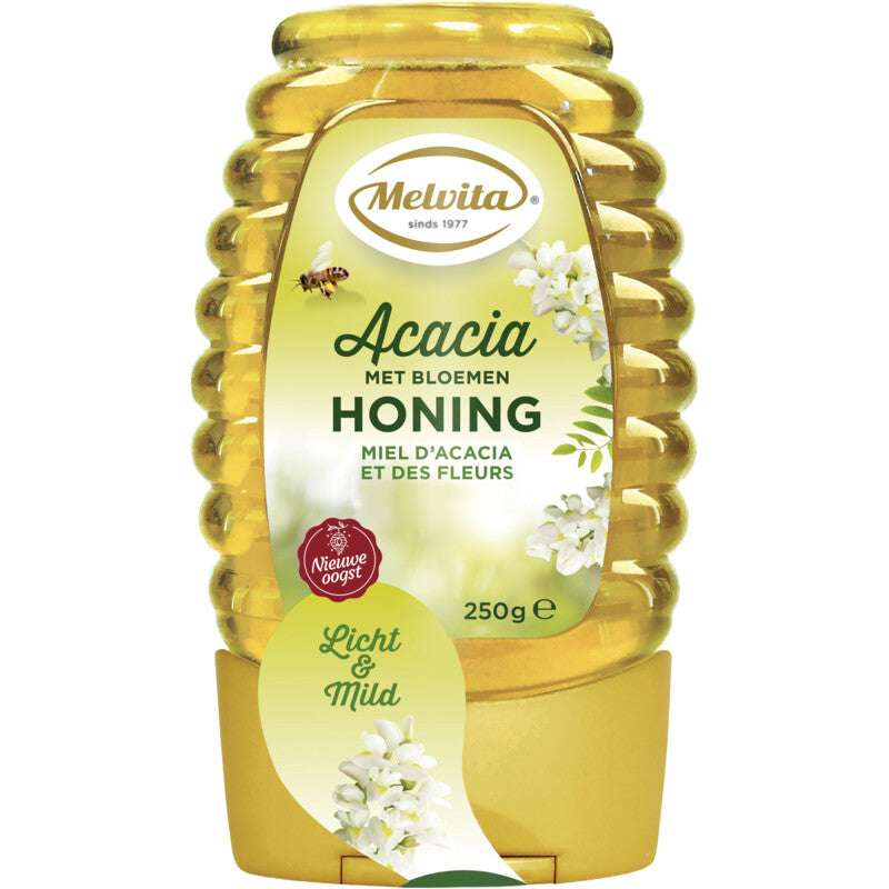 Voor deze honing vliegen de bijen op de prachtige acaciabomen in de europese natuur. De honing is mooi licht van kleur en heerlijk mildzoet van smaak. Lekker in thee, bij je ontbijt of door salades Licht en mild van smaak 100% puur natuur Uit europa Wij van Melvita komen uit de flevopolder en sinds 1977 vewerken wij met veel passie onze honing. Honing is niet geschikt voor kinderen jonger dan 1 jaar.