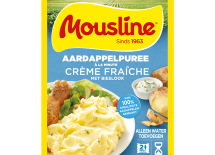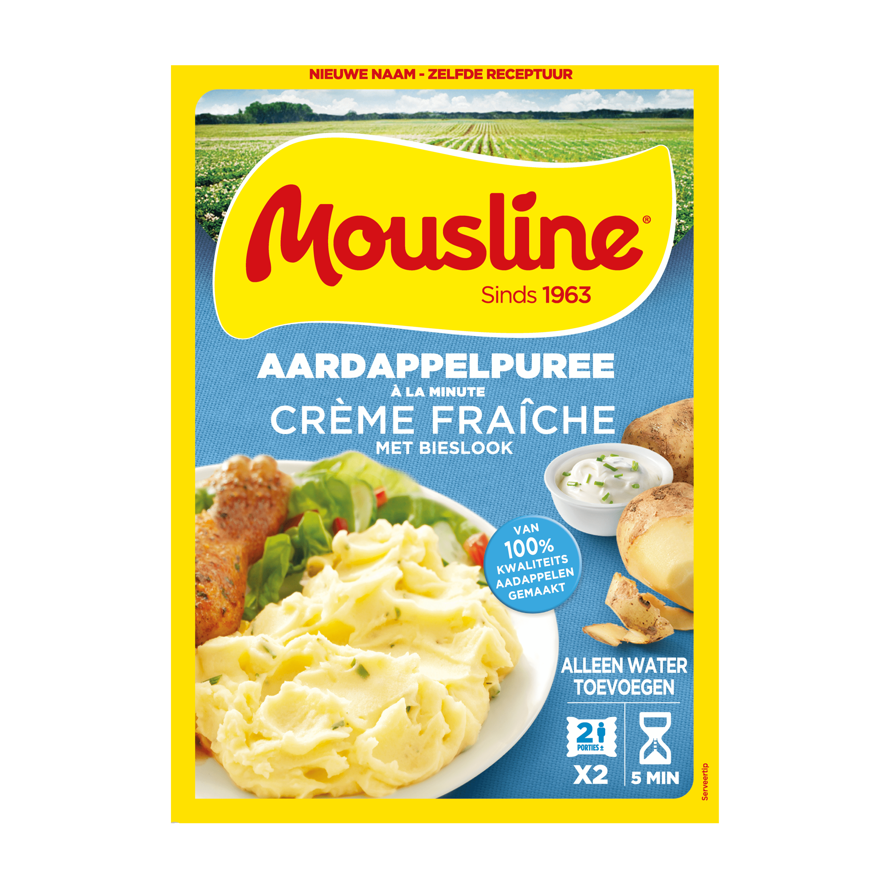 Nieuwe naam - zelfde receptuur. Alleen water toevoegen, 2 zakjes à ±2 porties Van 100% kwaliteitsaardappelen gemaakt. We kiezen de beste kwaliteit aardappelen die zorgvuldig worden geteeld en geoogst. De aardappelen worden voorzichtig geschild en gekookt om de kwaliteit te behouden. De schillen worden gebruikt als veevoer. De gekookte aardappelen worden tot puree gestampt. Daarna wordt de puree gedroogd en verpakt. Tijdens de productie wordt de helft van het gebruikte water recycled. Avalwater wordt gereinigd voor het wordt afgevoerd.