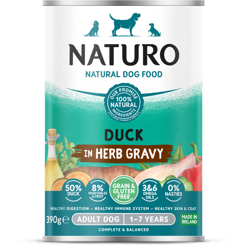 Naturo duck with blueberries, pumpkin and courgette in a herb gravy. This sensitive dog food does not contain rice