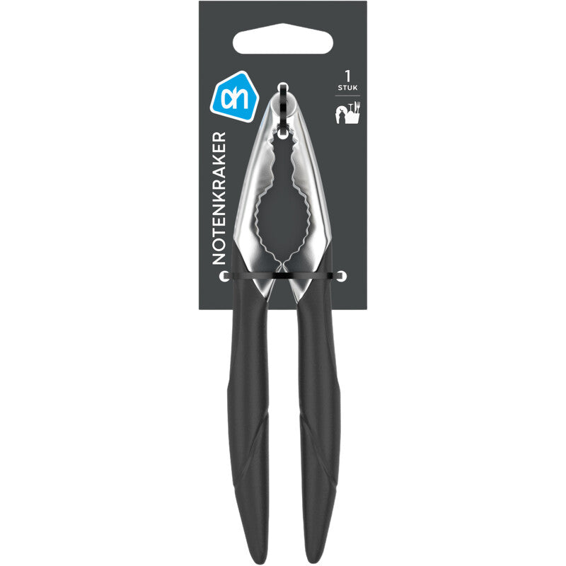 Een stevige roestvrij stalen notenkraker met een kunststof handvat.