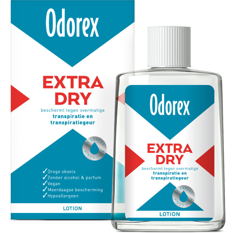 Odorex lotion extra dry. Voorkomt overmatige transpiratie Voorkomt transpiratiegeur Alcohol en parfumvrij Verbeterde formule Odorex extra dry lotion onderdrukt op een verantwoorde manier overmatige transpiratie en voorkomt transpiratiegeur. De verbeterde formule is nu nog effectiever en milder voor de huid. Bovendien is Odorex extra dry lotion alcoholvrij en parfumvrij. Je brengt de lotion 's avonds voor het slapen gaan met een watje op je oksel aan, en je hoeft het maar 2-3 keer per week te gebruiken. Het is niet nodig naast Odorex extra dry nog een reguliere deodorant te gebruiken, maar dit kan uiteraard wel als je dat prettig vindt. Odorex extra dry lotion is verkrijgbaar bij de drogist en in sommige supermarkten.