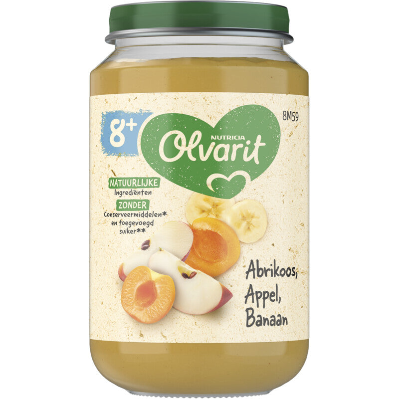 Olvarit Abrikoos Appel Banaan is een fruithapje met pure & natuurlijke ingrediënten voor baby’s van 8+ mnd. De babyvoeding heeft een herkenbare smaak en textuur dat bijdraagt aan de smaakontwikkeling. Een heerlijk fruithapje met pure & natuurlijke ingrediënten. Een babyhapje met één fruitsoort in de hoofdrol en de juiste structuur. Babyvoeding, gemaakt met passie voor goed eten en zorg voor de planeet. Samen met onze boeren zetten we ons in voor duurzame landbouw. Met meer dan 75 jaar passie en kennis zet Olvarit zich in voor (h)eerlijke babyvoeding, gemaakt met pure en natuurlijke ingrediënten en op een verantwoorde manier geteeld.