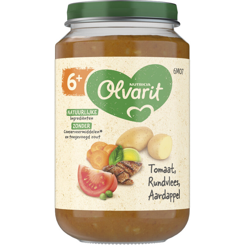 Olvarit Tomaat Rundvlees Aardappel Wortel is een babyhapje met pure & natuurlijke ingrediënten voor baby’s van 6+ maanden. De babyvoeding heeft een herkenbare smaak en textuur. Een heerlijk babyhapje met pure & natuurlijke ingrediënten. Een babyhapje met één groente in de hoofdrol en een aangepaste structuur. Babyvoeding, gemaakt met passie voor goed eten en zorg voor de planeet. Samen met onze boeren zetten we ons in voor duurzame landbouw. Met meer dan 75 jaar passie en kennis zet Olvarit zich in voor (h)eerlijke babyvoeding, gemaakt met pure en natuurlijke ingrediënten en op een verantwoorde manier geteeld.