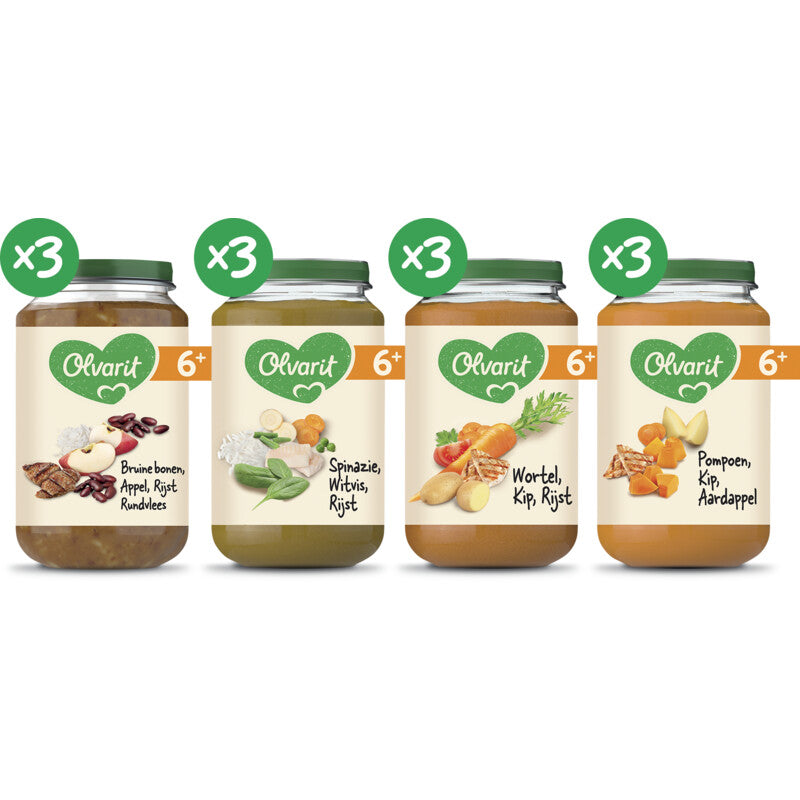 Olvarit Variatiemenu Maaltijd bevat 4 smaken babyvoeding. Babyhapjes met pure & natuurlijke ingrediënten voor baby's vanaf 6m+ met herkenbare smaak & textuur dat bijdraagt aan de smaakontwikkeling. Een heerlijk babyhapje met pure & natuurlijke ingrediënten. Een babyhapje met één groente in de hoofdrol en een aangepaste structuur. Babyvoeding, gemaakt met passie voor goed eten en zorg voor de planeet. Samen met onze boeren zetten we ons in voor duurzame landbouw. Met meer dan 75 jaar passie en kennis zet Olvarit zich in voor (h)eerlijke babyvoeding, gemaakt met pure en natuurlijke ingrediënten en op een verantwoorde manier geteeld.