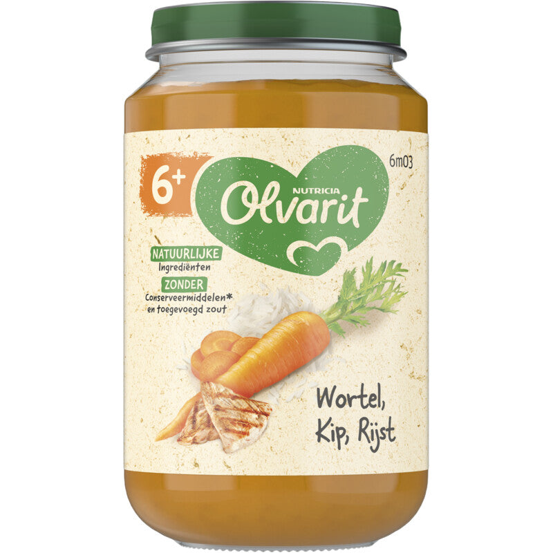 Olvarit Wortel Kip Rijst is een babyhapje met pure & natuurlijke ingrediënten voor baby’s van 6+ mnd. De babyvoeding heeft een herkenbare smaak en textuur dat bijdraagt aan de smaakontwikkeling. Een heerlijk babyhapje met pure & natuurlijke ingrediënten. Een babyhapje met één groente in de hoofdrol en een aangepaste structuur. Babyvoeding, gemaakt met passie voor goed eten en zorg voor de planeet. Samen met onze boeren zetten we ons in voor duurzame landbouw. Met meer dan 75 jaar passie en kennis zet Olvarit zich in voor (h)eerlijke babyvoeding, gemaakt met pure en natuurlijke ingrediënten en op een verantwoorde manier geteeld.
