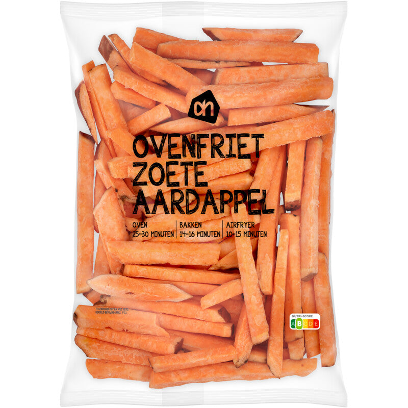 Dat is handig! Deze zoete aardappelen zijn alvast in de vorm van frietjes gesneden. Zo wordt het nog leuker en lekkerder om voldoende groente te eten! De zoete aardappelfrites bak je in 25-30 minuten gaar in de oven (200°C) met een scheutje (olijf)olie Een frituurpan is dus overbodig Voor gemiddeld 2 porties Valt in de smaak bij jong en oud Prijsfavorieten: topkwaliteit en altijd laaggeprijsd Met deze frietjes laat je kids extra groente eten Dit product is een Prijsfavoriet. Dat zijn onze eigen-merkproducten van topkwaliteit en ze zijn altijd voordelig. Je herkent ze aan het blauwe duimpje. Dat is handig! Deze zoete aardappelen zijn alvast in de vorm van frietjes gesneden. De zoete aardappelfrites bak je in 25-30 minuten gaar in de oven (200°C) met een scheutje (olijf)olie. Een frituurpan is dus overbodig!​ Voor gemiddeld 2 porties​ Valt in de smaak bij jong en oud​ Prijsfavorieten: topkwaliteit en altijd laaggeprijsd​