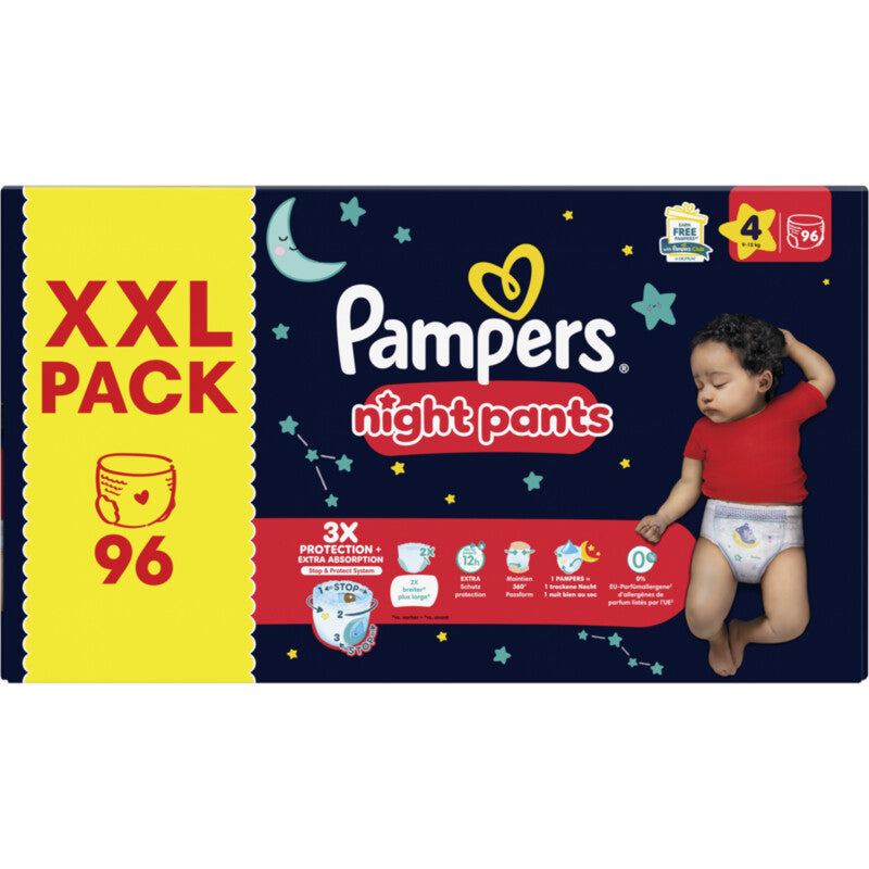 Geef je baby Pampers beste bescherming 's nachts met Pampers night pants: door hun superabsorberende kern zijn ze het meest absorberende product van Pampers en bieden tot 100% lekvrije nachten!Onze meest absorberende luierbroekjes bieden tot 100% lekvrije nachten2x bredere* beschermrandjes om lekken rond de beentjes te helpen voorkomenStop en protect pocket helpt lekken aan de achterkant360 graden pasvorm die zich aanpast aan de nachtelijke bewegingen van je baby