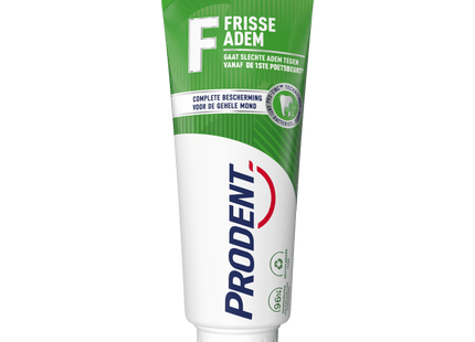 Prodent Frisse Adem Tandpasta zorgt dat de gehele mond dagelijks beschermd is en gezond blijft. Deze tandpasta gaat een slechte adem tegen vanaf de eerste poetsbeurt*. De formule van deze tandpasta met Pro-Zinc Technologie bestrijdt bacteriën niet alleen op de tanden, maar ook op tandvlees, wangen en tong. De Pro-Zinc Technologie heeft namelijk een prebiotisch effect, die de natuurlijke afweer van de mond versterkt door de goede bacteriën te laten toenemen en de slechte te verminderen. Het resultaat is een 24 uur antibacteriële werking en 3x efficiëntere complete bescherming**, voor gezonde tanden, tandvlees, wangen en tong. De doeltreffende formule is geschikt voor het hele gezin.
