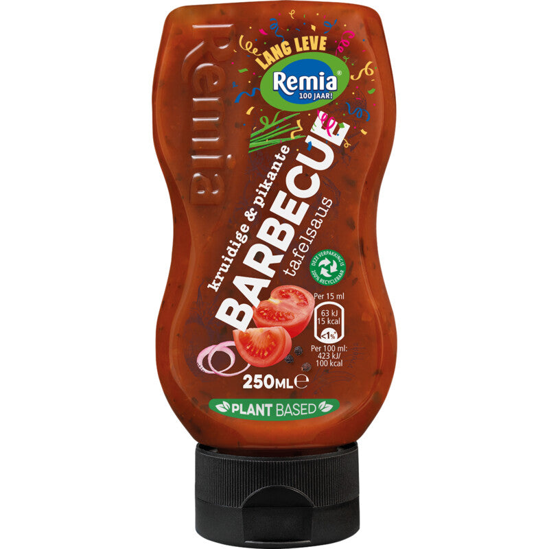 Remia barbecuesaus is een zoete, rijk gevulde saus met stukjes ui en paprika. Lekker bij gegrild vlees, een hamburger of worst In handige knijptube met doseerdop Probeer ook een van de andere tafelsauzen van remia De tafelsauzen van remia: beter, lekkerder, handiger Remia is een Nederlands familiebedrijf, waar al sinds 1925 de lekkerste sauzen en smaakmakers worden gemaakt! Bovendien is Remia de eerste sauzenfabriek van europa, waar klimaatneutraal wordt geproduceerd.