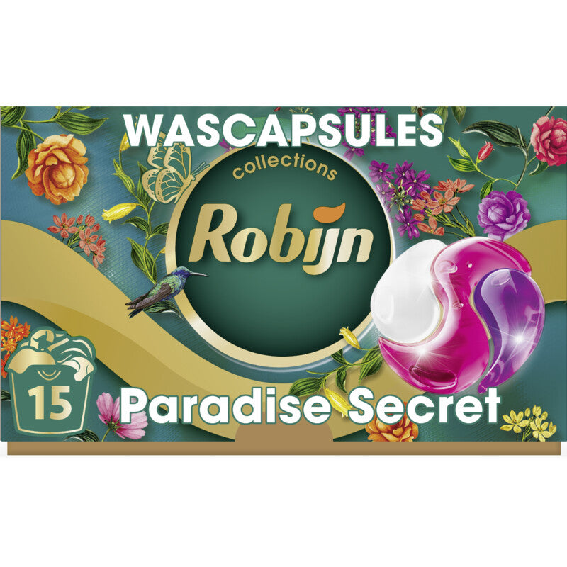 Robijn collections color paradise secret 3-in-1 wascapsules met 98% biologisch afbreekbare ingredienten zijn speciaal ontwikkeld voor de bonte en gekleurde was. Robijn color paradise secret 3-in-1 wascapsules met langdurige geurbeleving Deze wascapsules zijn verrijkt met een intense, botanische geur Helpt gekleurde was lang mooi te houden, zelfs in koude en korte wasbeurten Met 98% biologisch afbreekbare ingredienten voor duurzamer wassen Over Robijn collections color paradise secret 3-in-1 wascapsules: Robijn collections color paradise secret 3-in-1 wascapsules zijn verrijkt met een intense, botanische geur voor een vleugje paradijs in iedere wasbeurt. Hierdoor geniet jij na iedere wasbeurt van een langdurige geurbeleving. Deze wascapsules zijn speciaal ontwikkeld voor de bonte en gekleurde was, om kleuren lang mooi te houden. De Robijn 3-in-1 wascapsules bevatten 98% biologisch afbreekbare ingredienten voor duurzamer wassen en zijn 100% oplosbaar in water. Eventuele resten op kleding kunnen makkelijk worden verwijderd door het met warm water af te spoelen. Onze kartonnen verpakking is bovendien 100% plasticvrij (exclusief lijm en laklaag) en 100% recyclebaar. Hoe te gebruiken: doe een capsule in de trommel, voordat de was erin gaat, en zet de wasmachine aan op het juiste wasprogramma. De Robijn 3-in-1 wascapsules maken perfect schoon in koude (20 graden celsius) en korte wasbeurten (30 minuten). Let op: voor het beste resultaat stop je de machine niet te vol. Voorwassen is niet nodig. De wascapsules niet met vochtige handen vastpakken: hierdoor kan de beschermfolie rondom de capsules oplossen en kunnen ze aan elkaar gaan plakken. Was je handen na gebruik van de capsules. Bewaar de wascapsules op een koele en droge plaats. Genieten met robijn: Robijn vindt het belangrijk dat we kunnen genieten in een wereld die maar doorraast en soms aan ons voorbij vliegt. Juist van kleine dingen, zoals de geuren en kleuren die je in het dagelijks leven tegenkomt. Om ervoor te zorgen dat je altijd in geuren en kleuren kunt genieten, steekt Robijn veel zorg en aandacht in het ontwikkelen van producten. Wasverzachters met heerlijke geuren, en wasmiddelen die kleuren lang mooi houden. Daarmee brengt Robijn deze genietmomentjes ook binnenshuis tot leven: tijdens het aantrekken van Pas gewassen jeans of als je tussen de lakens stapt, gewassen met heerlijk ruikend wasmiddel en wasverzachter. Het motto van Robijn is `geniet in geuren en kleuren`. Met wasmiddelen en wasverzachters van Robijn zorg je dat je kleding langer als nieuw blijft, en bovendien heerlijk ruikt.