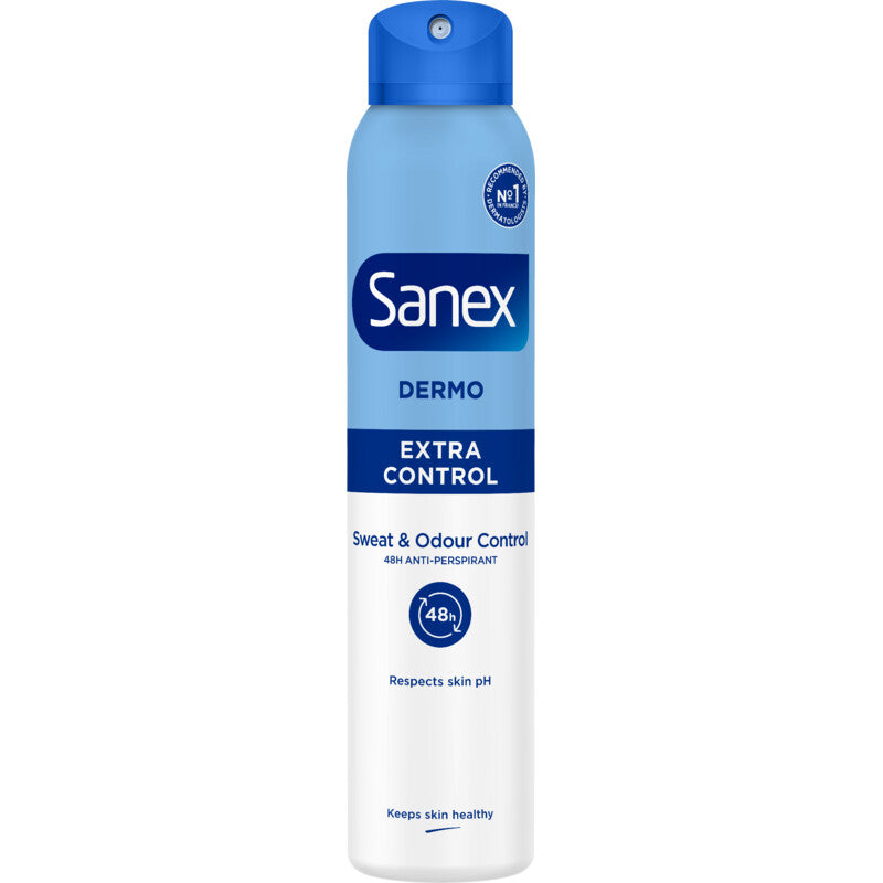 Sanex dermo extra control antitranspirantspray geeft je vertrouwen door effectieve bescherming tegen zweet en geurtjes, tot 48 uur lang. Herstelt de natuurlijke ph-waarde van de huid Dermatologisch getest Houdt de huid gezond de antitranspirantspray herstelt ook de natuurlijke ph-waarde van je huid. Je kunt de drukste dagen aan wanneer je Sanex dermo extra control anti transpirant deodorant spray gebruikt. Deze anti transpirant spray is speciaal samengesteld om je tot wel 48 uur lang effectief te beschermen tegen zweet en geurtjes, zodat je aan je drukke dag kunt beginnen met een zorg minder. Niet alleen beschermt deze anti transpirant spray je tegen zweet en geurtjes, het verzorgt ook je okselhuid. De anti transpirant spray is dermatologisch getest en speciaal ontwikkeld om de natuurlijke ph-waarde van de huid te herstellen. Houd je okselhuid optimaal verzorgd en gezond met sanex.