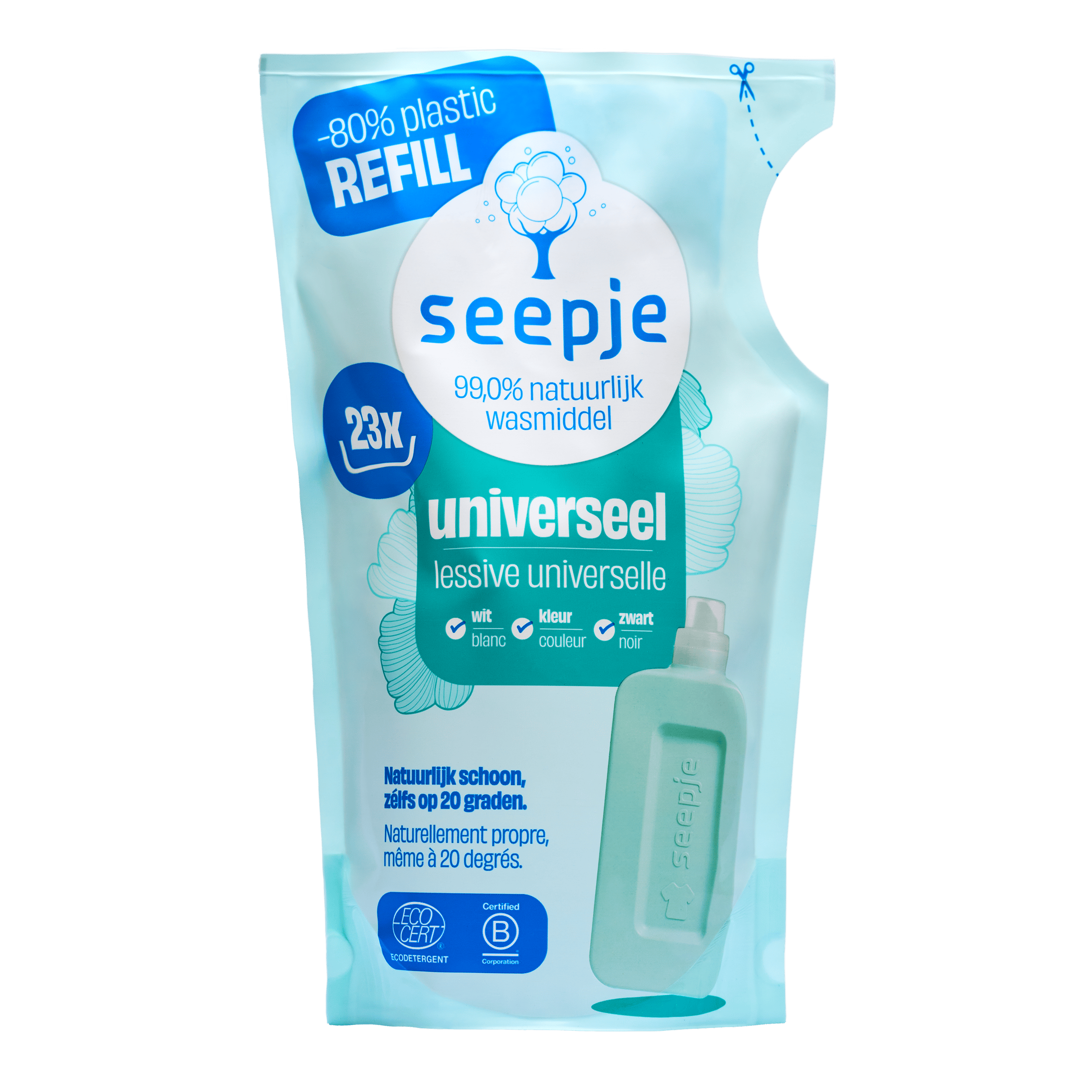 Seepje Natuurlijk Wasmiddel Verfrissende Jasmijn Universeel Navulling is geschikt voor witte was, zwarte was en gekleurde was. Met deze navulverpakking bespaar je 80% plastic!