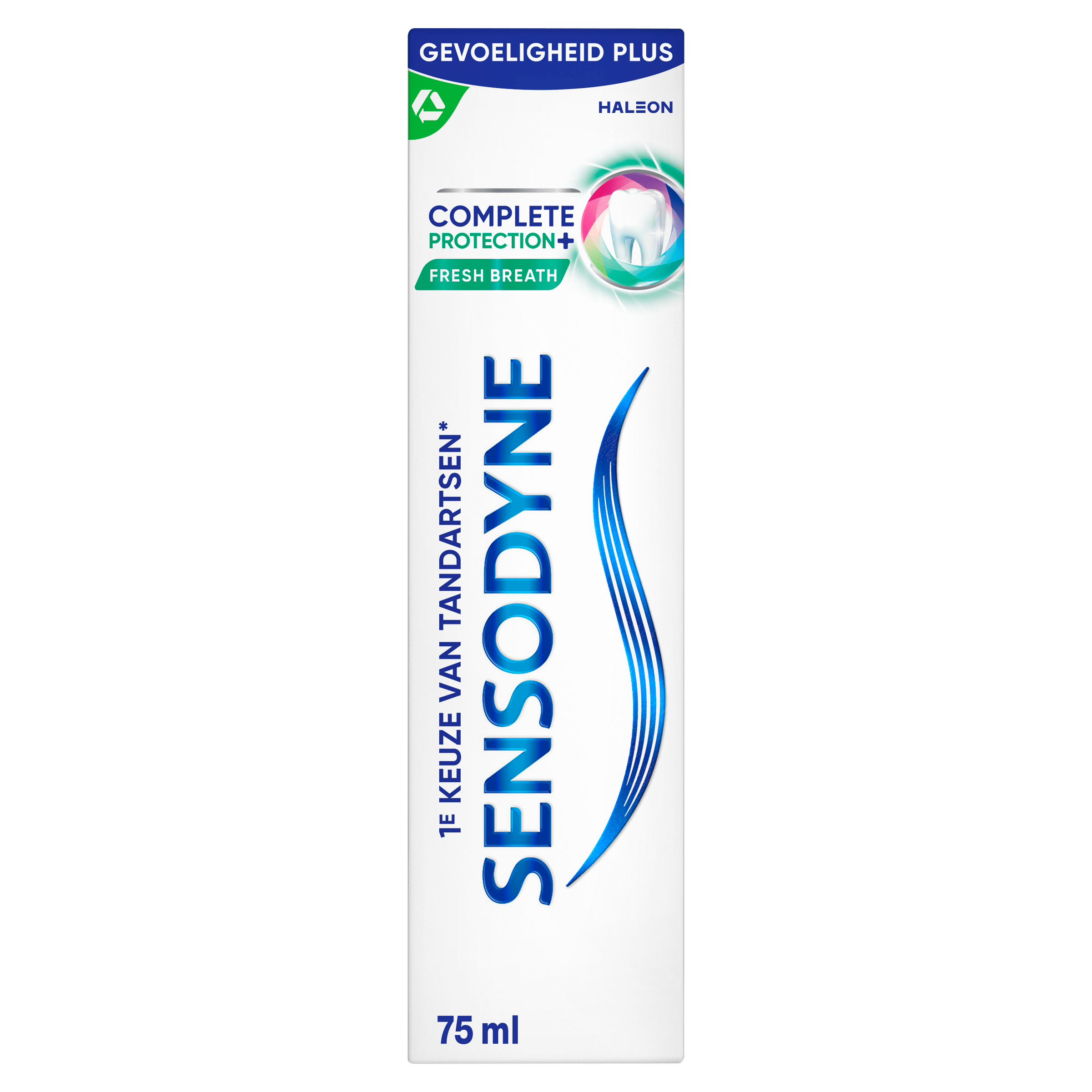 "Alles-in-1 dagelijkse verzorging bij gevoelige tanden. Vezorging bij gevoelige tanden mag niet ten koste gaan van andere belangrijke mondverzorgingsvoordelen. Nieuwe Sensodyne Complete Protection + dagelijkse tandpasta biedt meerdere mondverzorgingsvoordelen samen met klinisch bewezen bescherming tegen gevoeligheid. Fresh Breath voor een blijvend fris gevoel. Natuurlijke pepermunt en zoete groene munt met een vleugje citrusolie. Unieke formule met Advanced Cleaning System voor Superieure Reiniging*.