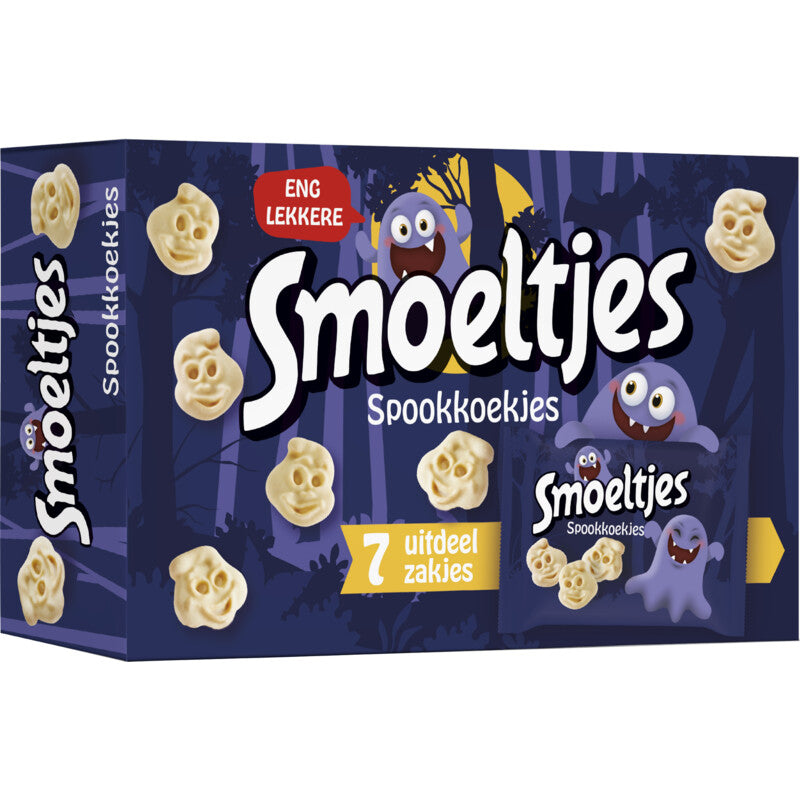 Heerlijke koekjes met een laagje witte imitatiechocolade.Smoeltjes zijn een bron van vezelsIn handige uitdeelzakjesEng lekkere Smoeltjes spookkoekjes