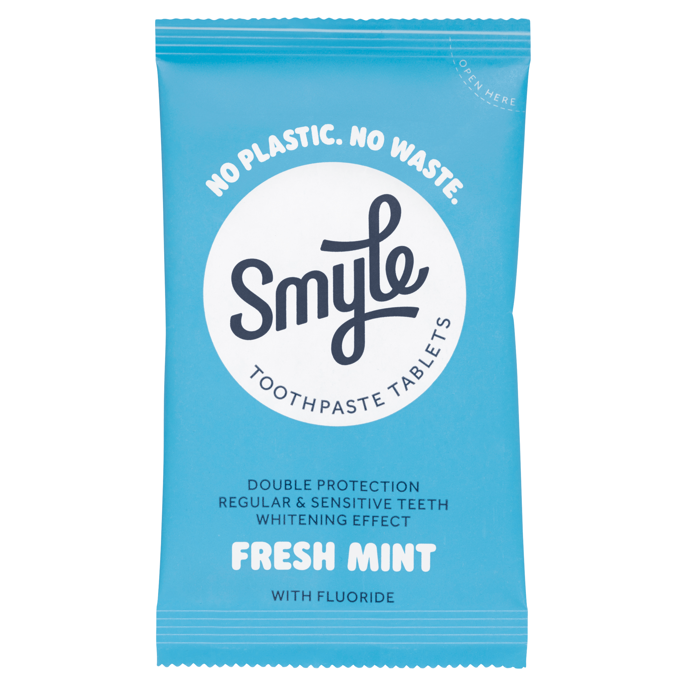 Smyle tandpasta tabletten biedt een dubbele bescherming aan, is te gebruiken voor normale en gevoelige tanden en heeft een whitening effect. Bevat 65 tabs, genoeg voor 1 maand poetsen, tweemaal per dag.