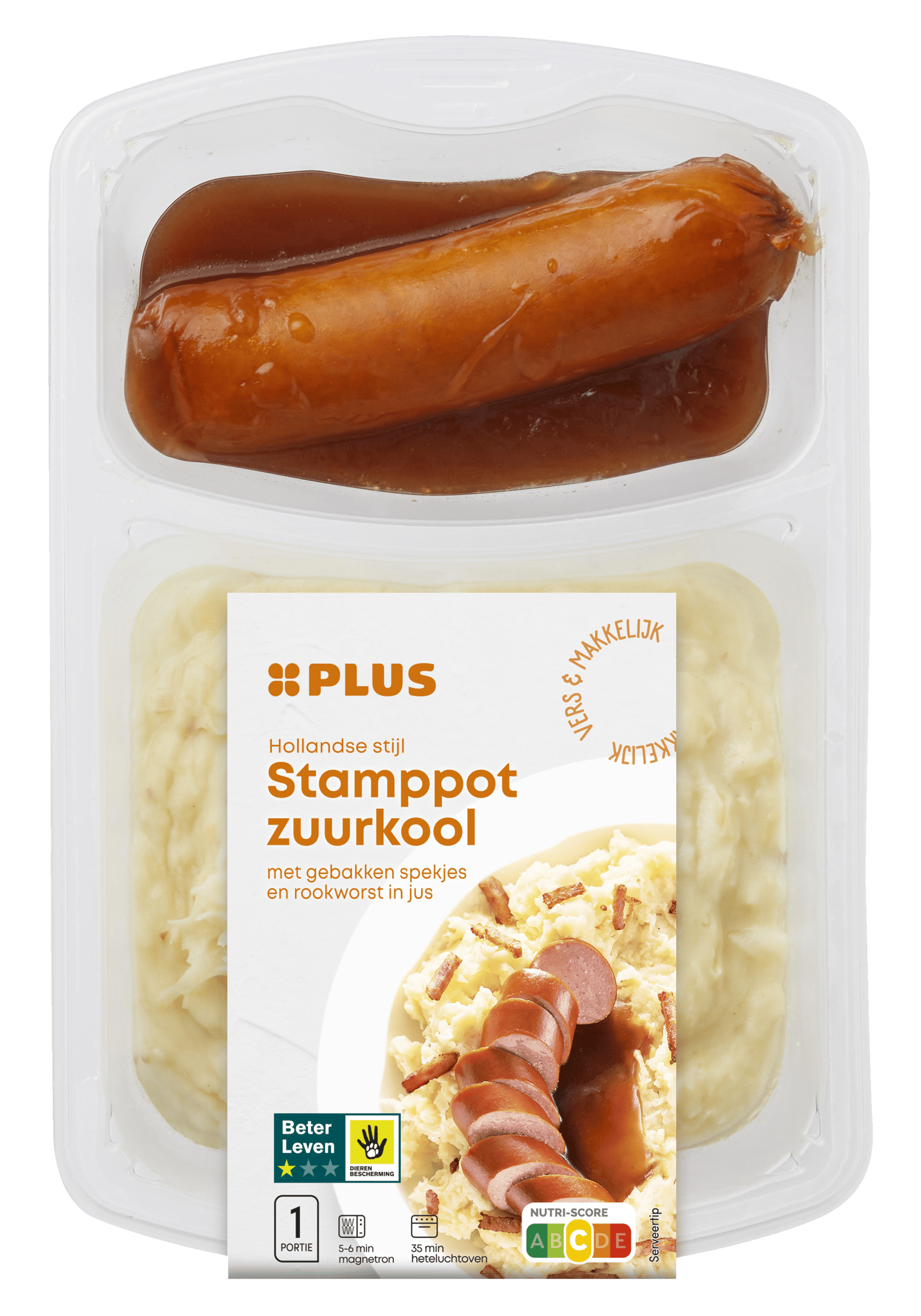 Ingrediënten :70% zuurkoolstamppot (55% gekookte aardappel, 31% zuurkool (witte kool, zout), water, varkensvet, 2% gegaarde spekjes (94% varkensvlees*, nitrietpekelzout (zout, conserveermiddel: E250), antioxidant: E301, specerijextracten (kardemom, peper), rozemarijnextract, rook), varkensspek*, aardappelvlokken, MELKPOEDER, zout, kaliumchloride, specerij, gistextract, natuurlijk aroma, gerookt zout), 16% rookworst (75% varkensvlees*, water, zuurteregelaar: E326/E330, vezels (erwtenvezel, inuline, psylliumvezel, aardappelvezel), natuurlijk aroma, zout, dextrose, conserveermiddel: E261/E250, stabilisator: E450, maltodextrine, antioxidant: E301, rundercollageen, rook), 14% jus (water, gemodificeerd maiszetmeel, natuurlijke aroma's (bevat SELDERIJ), raapzaadolie, suiker, tomatenpuree driemaal geconcentreerd, conserveermiddel: E202, zout, rode wijnextract, kaliumchloride, wijnazijn, gekaramelliseerde suiker, verdikkingsmiddel: E406, specerijen, druivenmostconcentraat, geroosterd uienpoeder, gistextract, kleurstof: E150d).