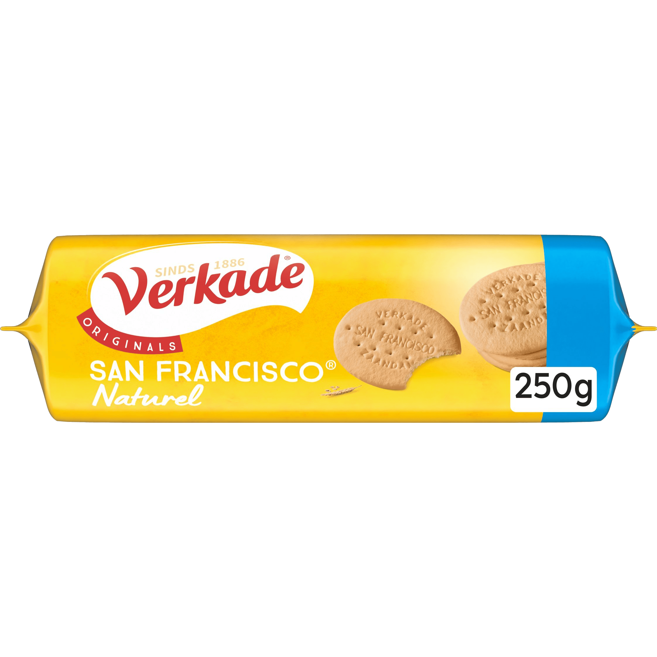 Verkade San Francisco Naturel is een knapperig biscuitje. Bekend om zijn licht zoete smaak en unieke ovale vorm. Een écht lekkere biscuit voor bij de koffie of thee en op elk moment van de dag. Geboren in Zaandam* *Verkade is opgericht in Zaandam in 1886. Meer informatie: www.verkade.nl