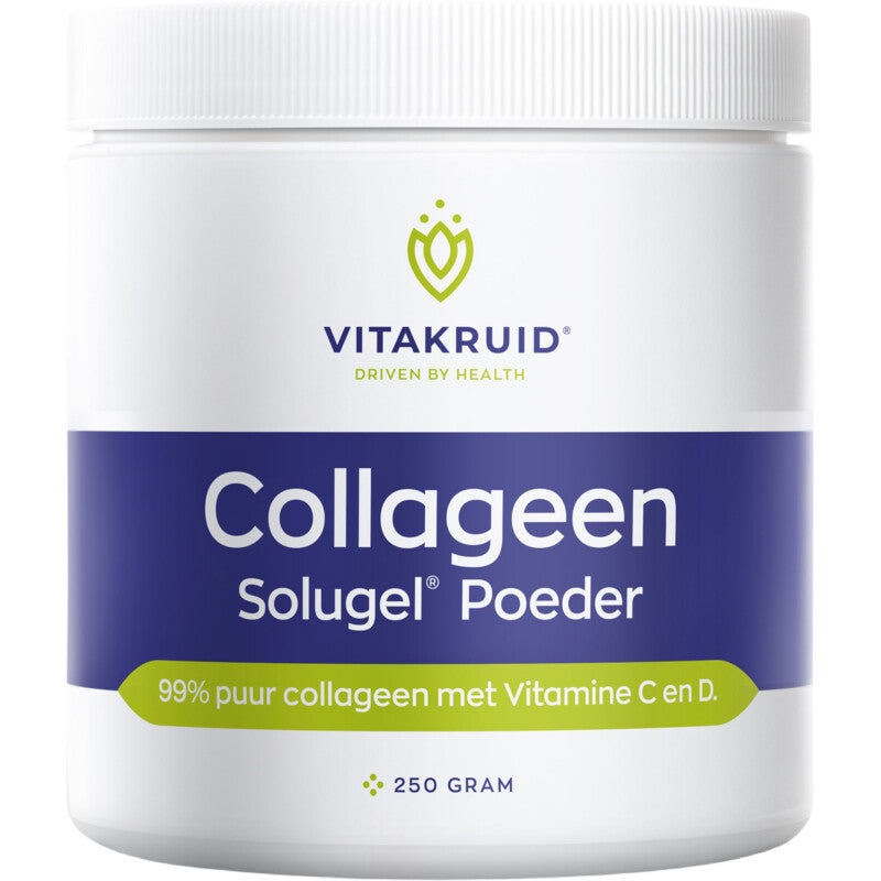 Vitakruid Collageen solugel poeder Vitakruid Collageen solugel poeder Product form €35 , 65 €38,85 (incl. btw) Quantity Voeg toe Add to cart Bewaren Ten minste houdbaar tot einde & batchnummer Zie onderzijde Droog, donker en op kamertemperatuur (15-25°C) bewaren.