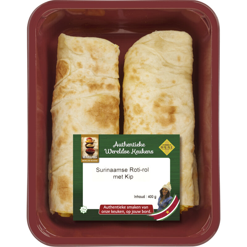 Het recept uit mama's receptenboek'. Chef Surinaamse keuken anchela heeft het meegenomen naar Nederland en kookt dagelijks de authentieke gevulde rotirol met kip.Dagelijks vers bereid met verse groenten, kip en vers rotivelUnieke maaltijd bereid door Surinaamse chefLekker makkelijk halalDe authentieke wereldse keukens en dat proef je