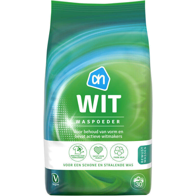 Ingrediënten: AH Waspoeder wit bevat o.a. de volgendeIngrediënten:Zeolieten, Zuurbleekmiddelen 15%-30%.Anionogene oppervlakteactieve stoffen 5%-15%.Niet-ionogene oppervlakteactieve stoffen, Polycarboxylaten, Fosfonaten <5%.Enzymen, Optische bleekmiddelen, Parfums (CITRONELLOL, GERANIOL).