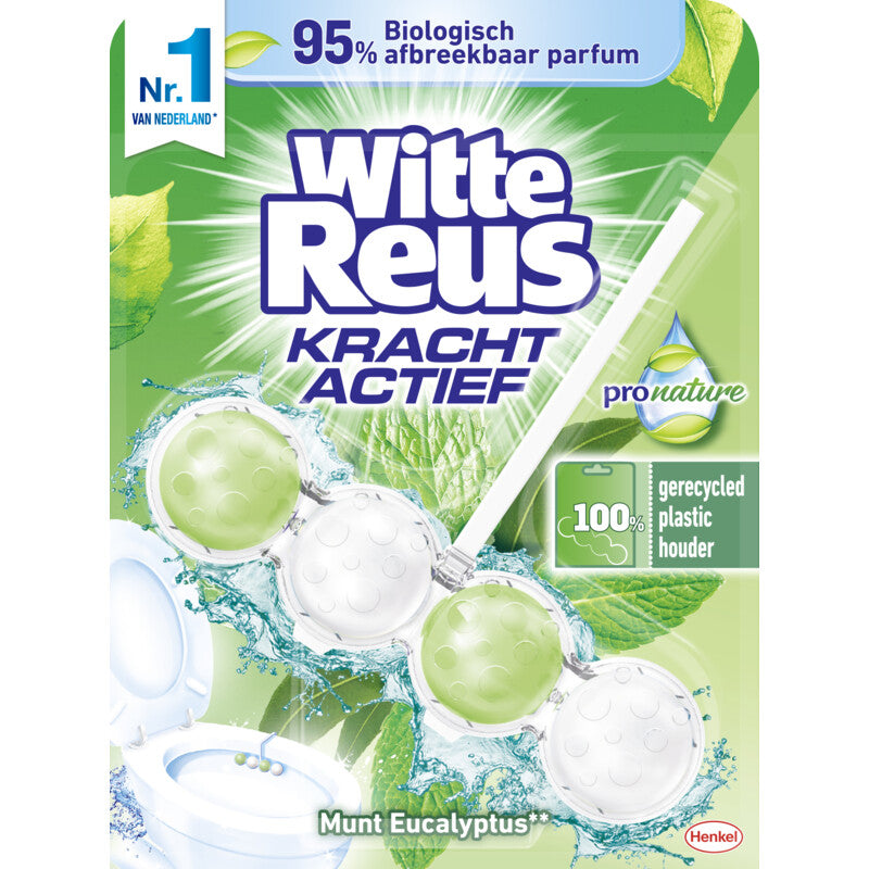 Witte Reus pro nature munt eucalyptus zorgt voor een schoon en fris toilet door middel van natuurlijke ingredienten. Het is een duurzame en handige Manier om te zorgen voor een schoon toilet. Reinigt je toilet bij elke spoelbeurt en voorkomt de vorming van vuil Formule bevat natuurlijke ingredienten en is vrij van siliconen Op de natuur geinspireerde munt- en eucalyptus geur voor extra frisheid Toiletblok met een 100% gerecyclede plastic houder en karton Witte Reus zorgt voor een hygienisch schoon toilet. Witte Reus Kracht Actief Pro Nature Munt Eucalyptus Toiletblok zorgt voor een schoon en fris toilet door middel van natuurlijke ingredienten. Het is een duurzame en handige Manier om te zorgen voor een schoon toilet van de eerste tot de laatste spoelbeurt. Witte Reus Pro Nature wcblok bestaat uit een 100% gerecyclede verpakking en houder. Daarnaast ondersteunt Pro Nature de Plastic Bank, een sociale onderneming die het plastic in de oceaan wil verminderen en kansen biedt aan mensen in armoede. Het karton en de houder van de toiletreiniger zijn 100% recyclebaar. Om te recyclen, scheid het karton van de plastic verpakking. Dit typische Nederlandse merk staat voor waskracht, kwaliteit en betrouwbaarheid. De wasmiddelen zijn verkrijgbaar in capsules, gels en poeder. Door de jaren heen is de Witte Reus familie gegroeid! Naast wasmiddelen biedt Witte Reus ook de meest complete oplossing voor het reinigen en fris houden van je toilet. De Witte Reus toiletblokken zijn de meest verkochte toiletblokken van Nederland!