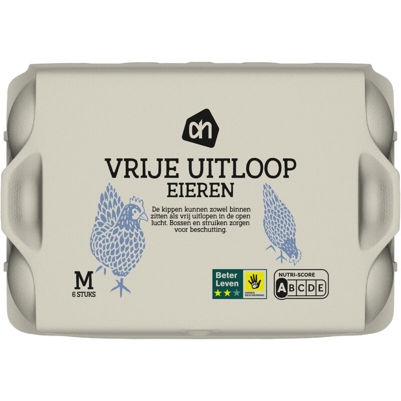 Koken, bakken, roerbakken, pocheren. Eieren worden in bijna elk gerecht wel gebruikt. Van omelet of frittata tot taarten, ovenschotels, salades en broodjes. Kortom, het is altijd handig om een doosje eieren paraat te hebben. 6 eieren Beter Leven keurmerk 1 ster De hennen worden tijdelijk binnen gehouden (opgehokt) ter bescherming van hun eigen gezondheid, de eieren heten daarom tijdelijk scharrelei in plaats van vrije-uitloopei. De hennen hebben nog wel toegang tot de overdekte buitenuitloop (veranda). Prijsfavorieten: topkwaliteit en altijd laaggeprijsd Dit product is een Prijsfavoriet. Dat zijn onze eigen-merkproducten van topkwaliteit en ze zijn altijd voordelig. Je herkent ze aan het blauwe duimpje. Verpakking met 6 vrije uitloop eieren wit klasse M Beter leven keurmerk 2 Sterren Bij het vrije-uitloopei krijgt het welzijn van de kip extra aandacht. Deze eieren worden gelegd door kippen die dagelijks de mogelijkheid krijgen om in de buitenlucht rond te scharrelen. Tevens hebben ze een overdekte uitloop tot hun beschikking. In geval van ophokplicht wegens vogelgriep hebben de leghennen, ter bescherming van hun eigen gezondheid, geen toegang tot de vrije uitloop.
