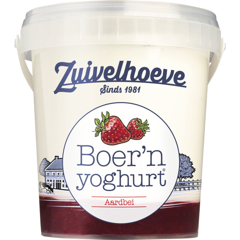Heerlijke volle, stevige boer'n yoghurt met aardbei. Gemaakt van verse weidemelk Heerlijk als dessert of tussendoortje Gemaakt op de boerderij van verse weidemelk Handige hersluitbare gezinsverpakking Onze boer'n yoghurt laten we 18 uur met rust. Daar wordt-ie lekker stevig van. Ga er fijn voor zitten en proef de volle, echte smaak. Gemaakt met de rust van de zuivelhoeve.