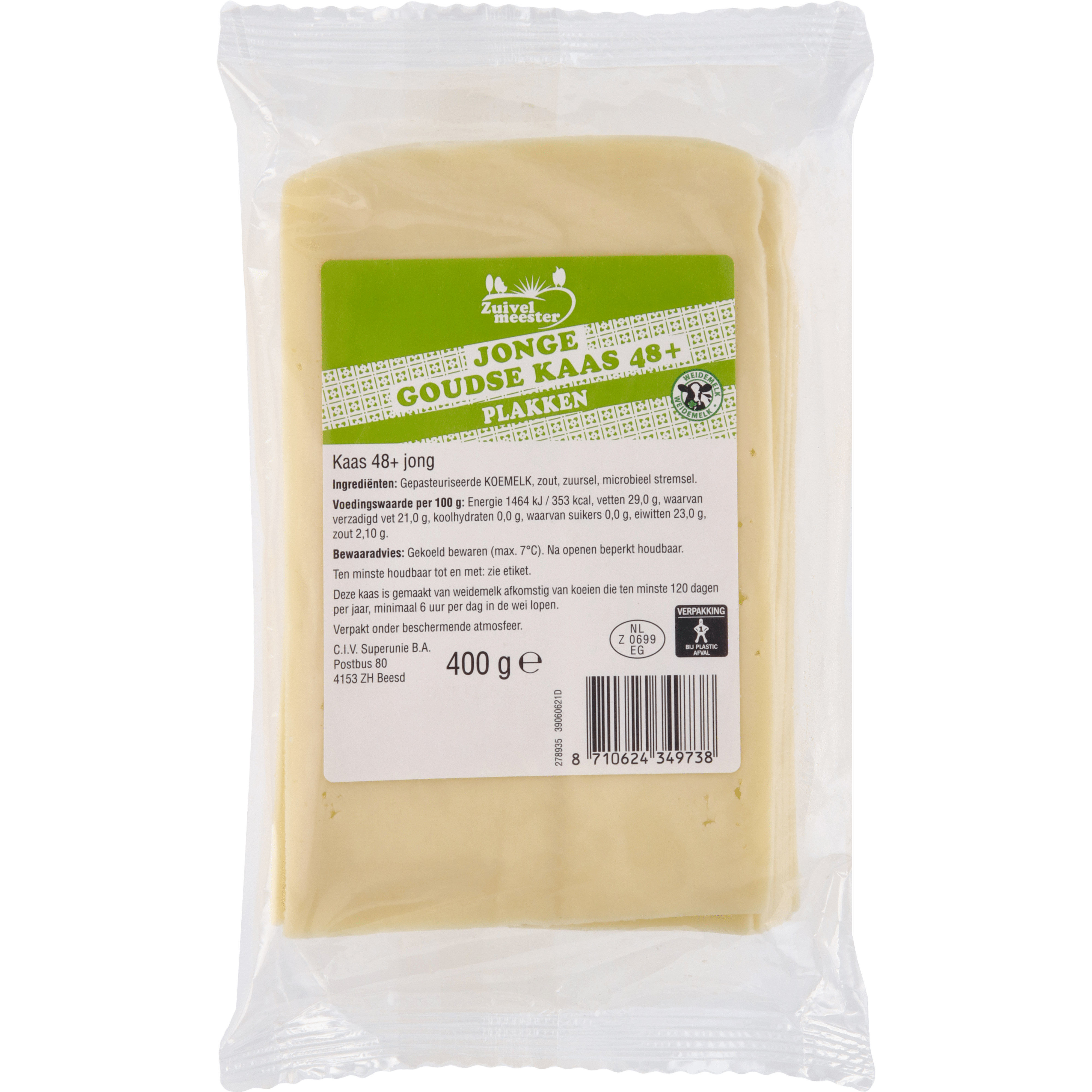 Zuivelmeester: Heerlijke plakken Goudse jong belegen kaas, gemaakt van melk van koeien die tenminste 120 dagen per jaar minimaal 6 uur per dag in de Nederlandse wei lopen. Heerlijk op de boterham of tosti.