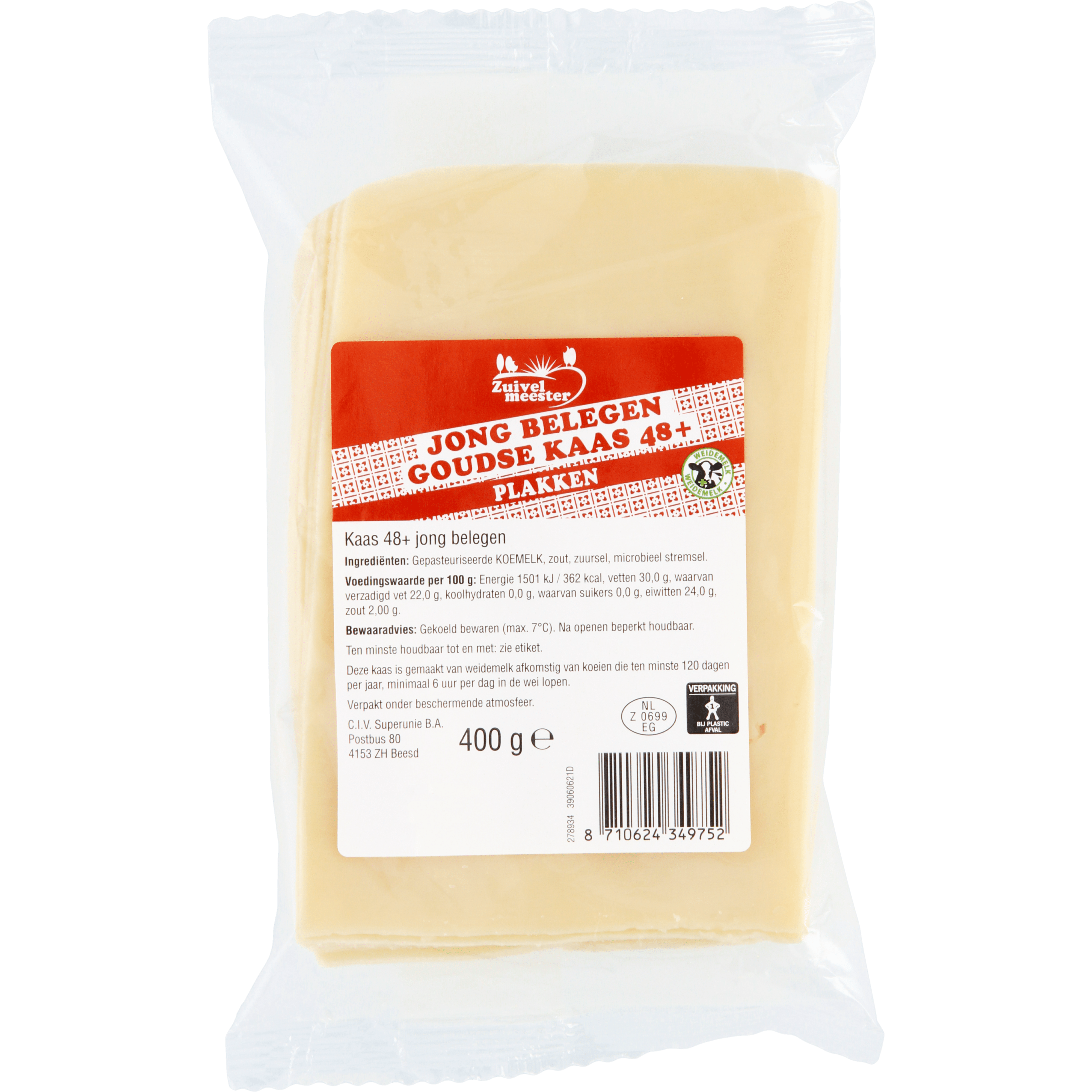 Zuivelmeester: Heerlijke plakken Goudse jonge kaas, gemaakt van melk van koeien die tenminste 120 dagen per jaar minimaal 6 uur per dag in de Nederlandse wei lopen. Heerlijk op de boterham of tosti.