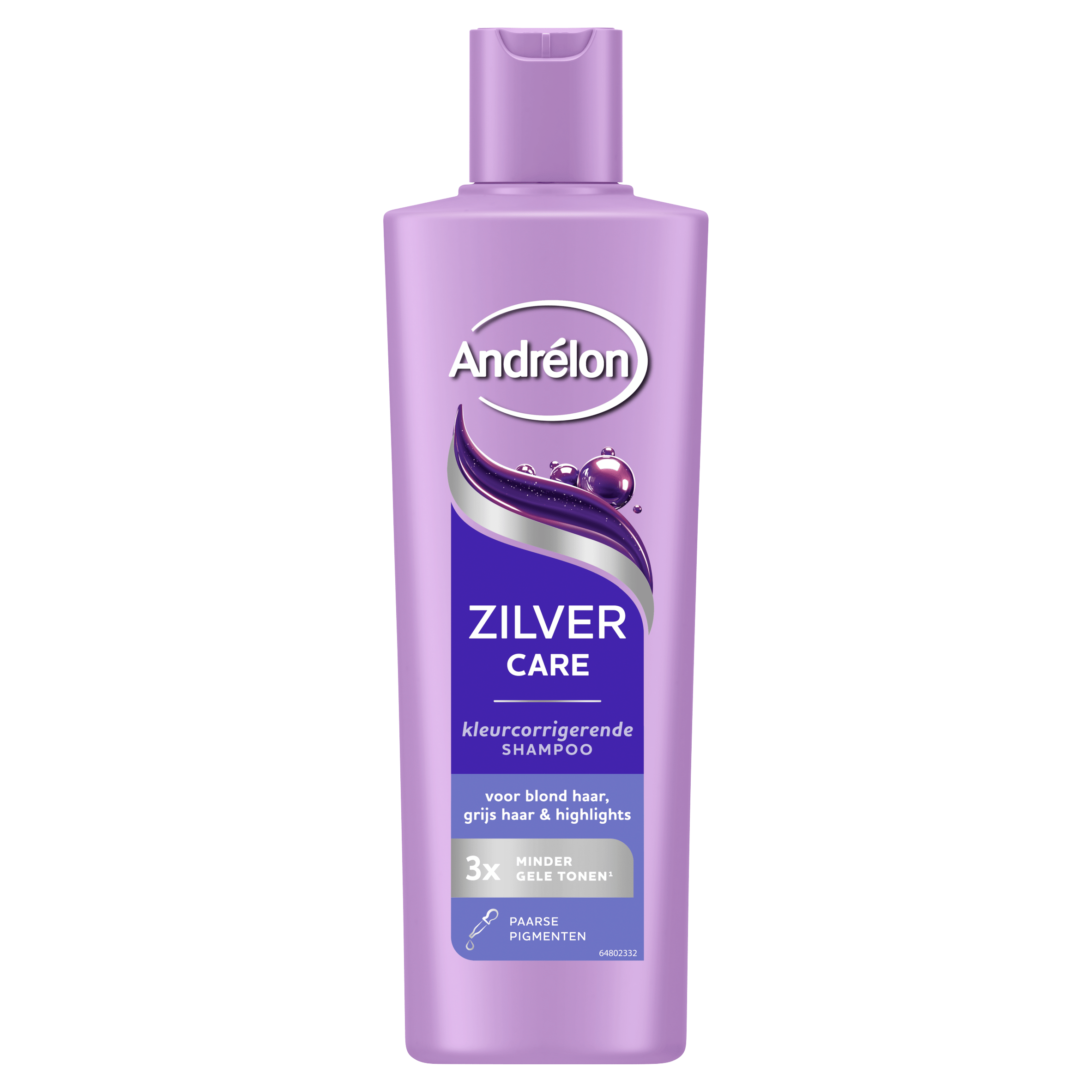 De kleurcorrigerende Andrélon Zilver Care Shampoo bevat paarse pigmenten
