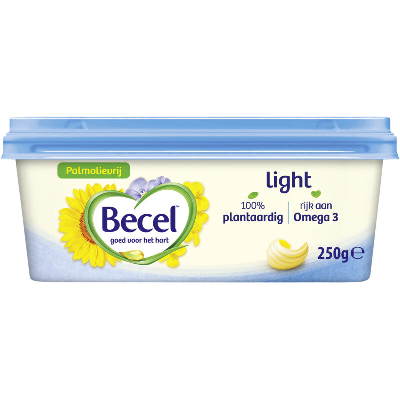 Een heerlijke, frisse spread voor op brood, speciaal voor wie op zijn calorie-inname wil letten. Palmolievrij, gemaakt met een mix van olien welke rijk aan omega 3. Dat maakt Becel goed voor het hart. Van nature rijk aan omega 3 en 6 en daarom goed voor het hart 100% plantaardig en 100% natuurlijke ingredienten 100% palmolievrij Verpakking gemaakt van meer dan 90% duurzaam plastic Becel light is een smeeerbaar product gemaakt van 100% plantaardige ingredienten. Becel light is speciaal voor wie op zijn calorie-inname wil letten en het bevat 30% minder calorieen dan Becel original. De basis van Becel bestaat uit een mix van olien die onder andere worden gehaald uit de zaden van zonnebloemen, lijnzaadbloemetjes en koolzaadbloemen die op het boerenland groeien. Om van deze olien een smeerbaar margarine product te maken, is een beperkte hoeveelheid 'hard vet' nodig. Becel gebruikt kokosolie als 'hard vet', wat dit product palmolievrij maakt. becel light levert een belangrijke bijdrage aan de benodigde dagelijkse hoeveelheid omega 3. Dat draagt bij aan het behoud van een gezond cholesterolgehalte in het bloed. En daarom is Becel goed voor het hart.op zoek naar een product om actiever te werken aan het verlagen van cholesterol doe je...