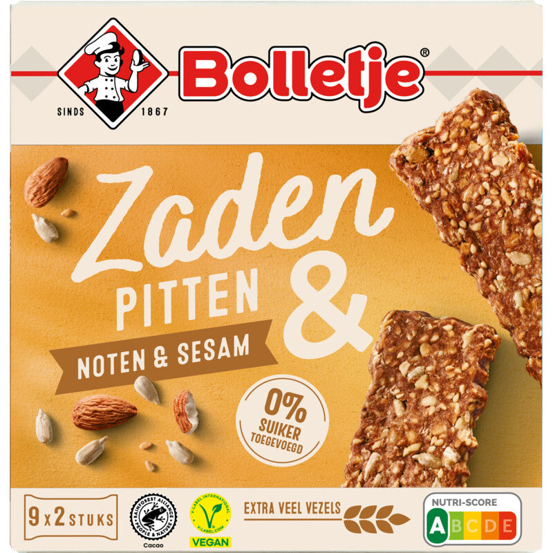 56% zaden, pitten en noten, waarvan 28% zonnebloempitten, 17% amandelstukjes en 11% geroosterd sesamzaad. 0% suiker toegevoegd! 0% suiker toegevoegd Nutri-score a Vegan 9x2 repen Ontdek de heerlijke Bolletje Zaden & Pitten Noten & Sesam, een perfecte snack voor een gezonde levensstijl! Dit product is speciaal samengesteld voor wie houdt van waardevolle voedingsstoffen zonder toegevoegde suikers. Met een unieke mix van zaden, pitten en noten, biedt elke reep jou een energieboost die je helpt om de dag door te komen. Ideaal voor drukke expats die een stukje Nederland in hun leven willen houden, zelfs als ze in het buitenland wonen. Gezond en voedzaam: Gemaakt met 56% zaden, pitten en noten voor een krachtige snack. Suikervrij: Volledig zonder toegevoegde suikers, perfect voor een verantwoord dieet. Bestellen via Dutchshopper is een slimme keuze voor iedereen die op zoek is naar authentieke Nederlandse producten. Veel van deze lekkere snacks zijn in het buitenland moeilijk te vinden. Met Bolletje’s Zaden & Pitten Noten & Sesam geniet je van een stukje huis in je dagelijkse routine. Pak deze gezondere snack voor onderweg of probeer hem uit bij je volgende borrel. Mooie zakjes met 9x2 repen zijn praktisch voor thuis, op kantoor of onderweg. Waar wacht...