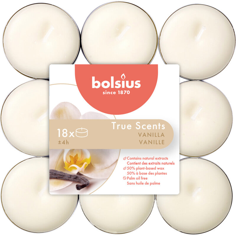 Bolsius geurtheelichten true scents vanille. natuurlijke extracten en plantaardige wax zonder palmolie en dierlijk vet perfecte vlam tot 4 uur pure geurbeleving Wat je ziet is wat je ruikt! De ivoorwitte Bolsius vanille waxinelichtjes branden tot wel 4 uur lang. Creeer een heerlijk thuisgevoel met deze smakelijke, cremige geur. Gemaakt met liefde voor mens en planeet. Zonder palmolie, met natuurlijke extracten en vegan wax. Ervaar de pure geurbeleving van zachte vanille bij jou thuis.