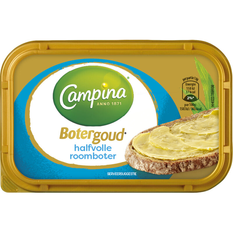 Campina botergoud halfvolle roomboter is romig en puur van smaak! Hetbevat 50% minder vet dan gewone roomboter maar heeft nog steeds die lekkere romige smaak. Heerlijk op vers, knapperig brood. Het bevat 50% minder vet dan gewone roomboter Minder calorieen