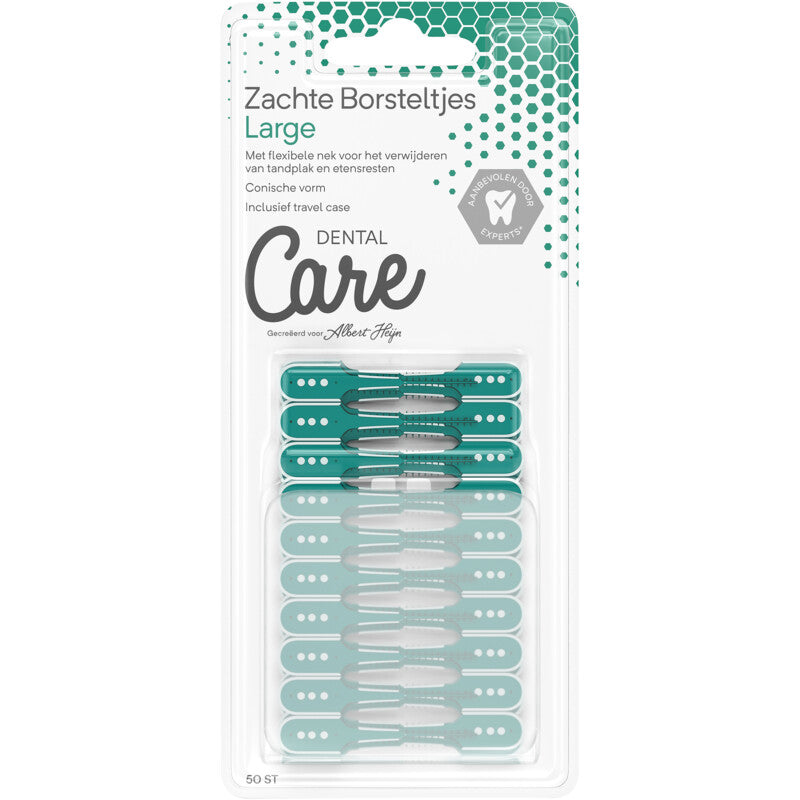Care Zachte borsteltjes large hebben rubberen borstelhaartjes, die zorgen voor een aangename en effectieve reiniging van de ruimtes tussen tanden en kiezen. Met handig reisdoosje. Ergonomisch handvat met een bredere grip en met een flexibele hals voor extra comfort en controle Aanbevolen door experts Care Zachte borsteltjes large hebben rubberen borstelhaartjes, die zorgen voor een aangename en effectieve reiniging van de ruimtes tussen tanden en kiezen. Met handig reisdoosje. Ergonomisch handvat met een bredere grip en met een flexibele hals voor extra comfort en controle Aanbevolen door experts