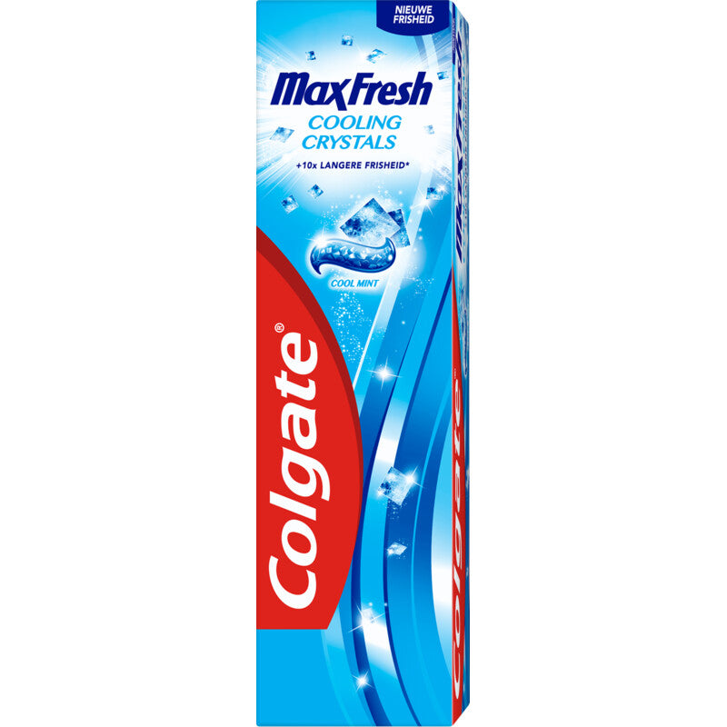 Poets met Colgate max fresh cooling crystals tandpasta om een compleet nieuwe dimensie van frisheid te ervaren door de verfrissende kristallen. Verfrist en reinigt de mond Zorgt voor wittere tanden Helpt beschermen tegen gaatjes Bevat fluoride