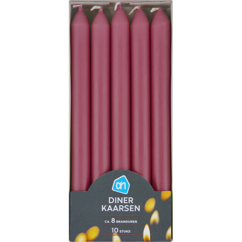 Prijsfavorieten: topkwaliteit en altijd laaggeprijsd Dit product is een Prijsfavoriet. Dat zijn onze eigen-merkproducten van topkwaliteit en ze zijn altijd voordelig. Je herkent ze aan het blauwe duimpje. AH Dinerkaarsen oud roze, 8 branduren​ 10 stuks​ Lengte: 23 cm​ Tip: mooi om te presenteren in een kandelaar of een dinerkaarshouder​