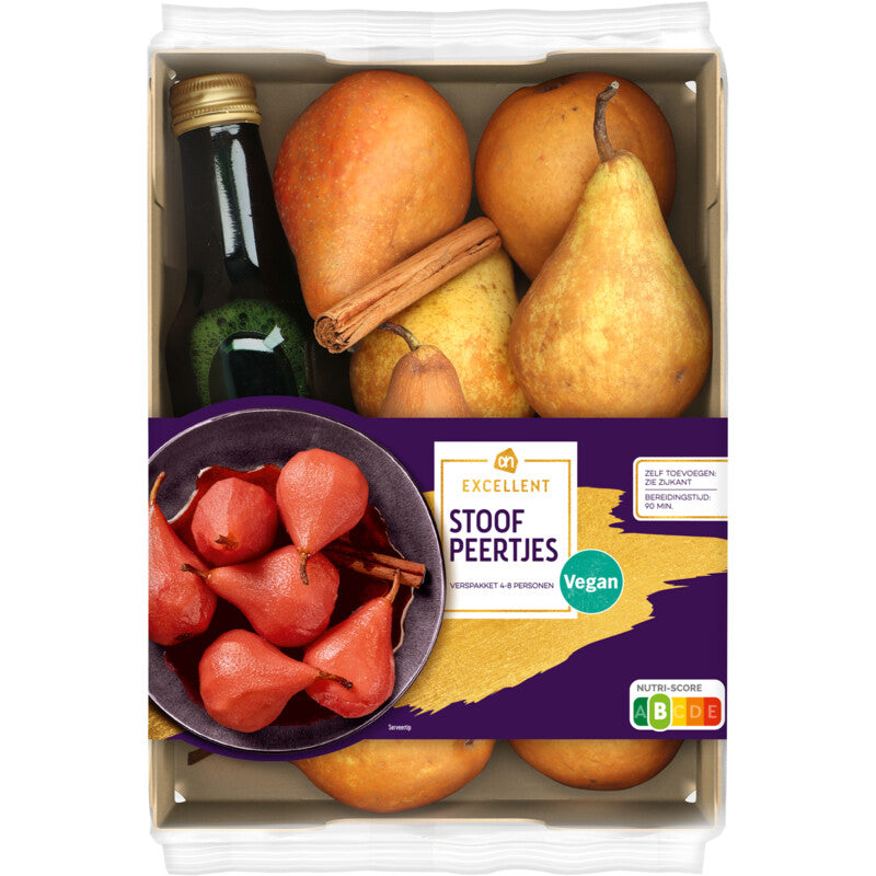 Zelf stoofperen maken? Maak het jezelf makkelijk met dit complete pakket. Alle ingrediënten zitten erin. Met als basis: de lekkerste stoofperen! Compleet met Betuwe rode bessensap en kaneelstokjes Ook lekker als toetje met kaneelijs Wat handig! Met dit pakket maak je in een handomdraai lekkere stoofpeertjes, die je met trots op tafel kunt zetten. Zo heb je altijd een bijzondere maaltijd paraat, met heerlijke ingrediënten en veel fruit. En het mooie is: het pakket bevat precies de juiste hoeveelheden. No waste, dus.​ 4-8 personen​ Zelf toevoegen: suiker naar smaak (50-100 g)​, 100 ml water Bereidingstijd: 90 minuten SERVEERTIP: Voor een minder zoete variant: voeg minder suiker toe (ca. 50g). Vervang het kaneelstokje door een stukje sinaasappelschil (5x2cm) en 2 kruidnagels. Vervang het bessensap door 150 ml rode wijn. Vervolg het recept op de verpakking.