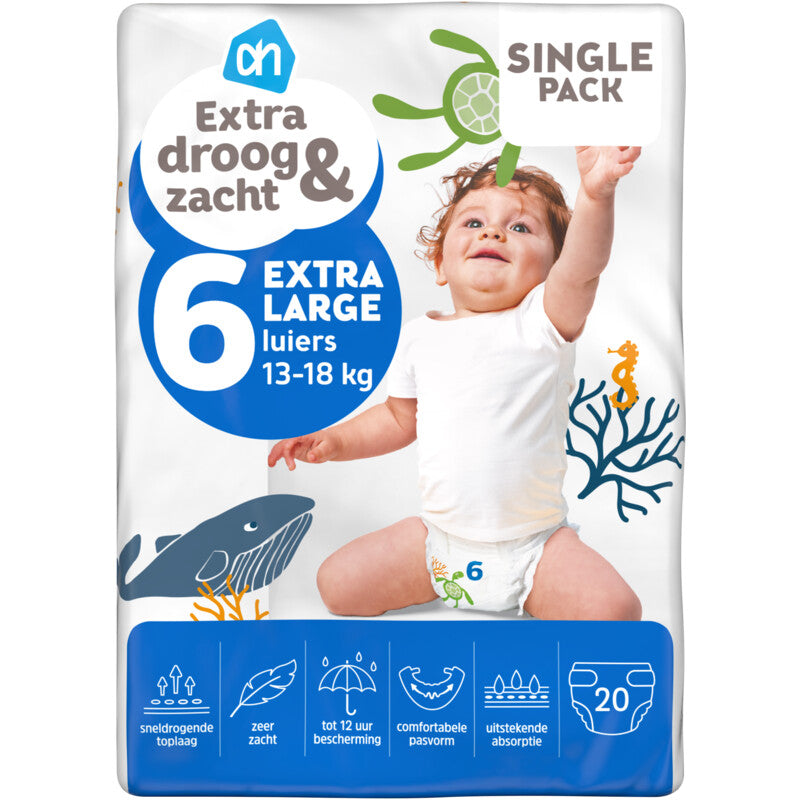 AH Luiers extra droog & zacht voelen extra comfortabel aan voor de huid door de zeer zachte toplaag. Langdurige droogheid en perfecte pasvorm. Uitstekende absorptie door een betere verdeling van het vocht over de kern. Voor 13-18 kg. Zeer zacht, uitstekende absorptie, sneldrogende toplaag, tot 12 uur bescherming en comfortabele pasvorm De toplaag is sneldrogend en zorgt dat de huid van je kindje zo lang mogelijk droog blijft Deze luier biedt tot wel 12 uur bescherming Dermatologisch getest, EU Ecolabel-gecertificeerd en de verpakking is gemaakt van 50% gerecycled materiaal
