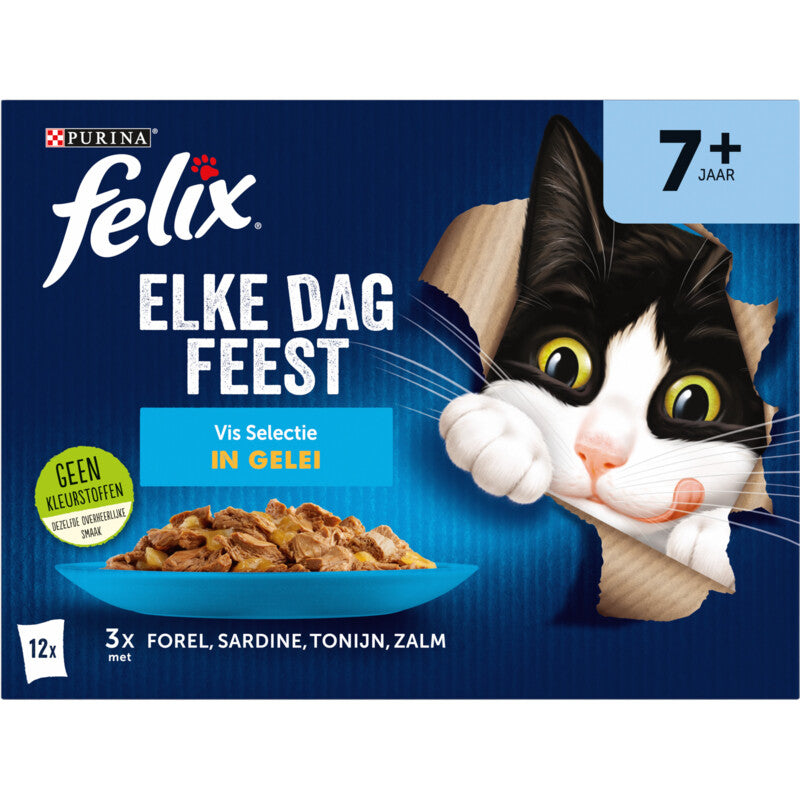 Felix elke dag feest: een assortiment onweerstaanbare maaltijden die er zo lekker uitzien, ruiken en smaken alsof je het zelf hebt gemaakt! Speciaal bereid met zachte stukjes in een heerlijke gelei. Geen toegevoegde kunstmatige smaakstoffen of conserveringsmiddelen 100% volledig en gebalanceerd Geen kleurstoffen, dezelfde overheerlijke smaak Vitamine d en e, bron van omega 6-vetzuren Felix elke dag feest 7+ is een assortiment onweerstaanbare maaltijden die er zo lekker uitzien, zo lekker ruiken en zo lekker smaken alsof je het zelf hebt klaargemaakt. Speciaal bereid met malse reepjes in een overheerlijke gelei. Jouw deugniet zal elke keer weer genieten van een onweerstaanbare maaltijd. elke maaltijd is speciaal ontworpen voor katten ouder dan 7 jaar met de juiste combinatie aan eiwitten vitamines inclusief antioxidanten die jouw kat klaar zullen maken om nog meer kattenkwaad uit te halen. ze zitten vol gezonde ingredienten om 100% te voldoen aan de dagelijkse behoeften van jouw kat indien gevoed volgens de voedingsrichtlijnen op de verpakking. felix - gewoonweg onweerstaanbaar!