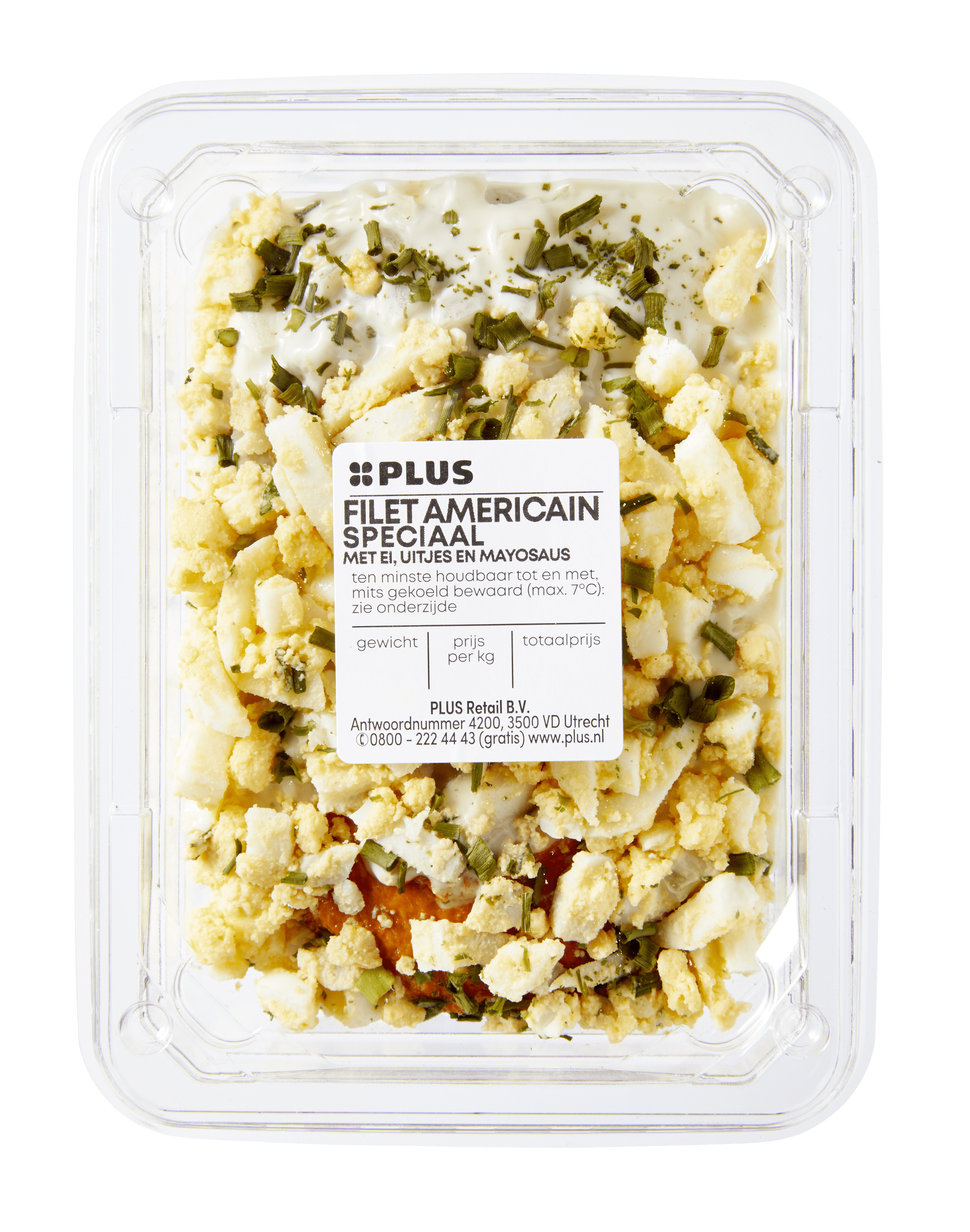 Ingrediënten :57% Filet americain (66% rundvlees, water, raapzaadolie, voedingszuur: E260/E262/E326/E330, SCHARRELKIPPENEI-EIGEEL, tomatenpuree, zout, extract van paprika, suiker, specerijen (o.a. MOSTERDZAAD), glucosestroop, azijn, gehydrolyseerde plantaardige eiwitten (raapzaad, koolzaad), zetmeel (rijst, aardappel), aroma's (MOSTERD), gedroogde groenten (champignon, pastinaak), dextrose, stabilisator: E331, gemodificeerd maïszetmeel, verdikkingsmiddel: xanthaangom/guarpitmeel, gistextract, MELKEIWITTEN, conserveermiddel: E202, tomatenpoeder, antioxidant: E300, specerijextracten (SELDERIJ, chilipeper)), 23% SCHARRELEI (99% SCHARRELEI, voedingszuur: E262, bieslook), 11% mayosaus (raapzaadolie, water, SCHARRELKIPPENEI-EIGEEL, suiker, azijn, aardappelzetmeel, zout, specerijen (o.a. MOSTERDZAAD), verdikkingsmiddel: xanthaangom/guarpitmeel, voedingszuur: citroenzuur, gehydrolyseerd koolzaadeiwit, conserveermiddel: E202), 9% ui.